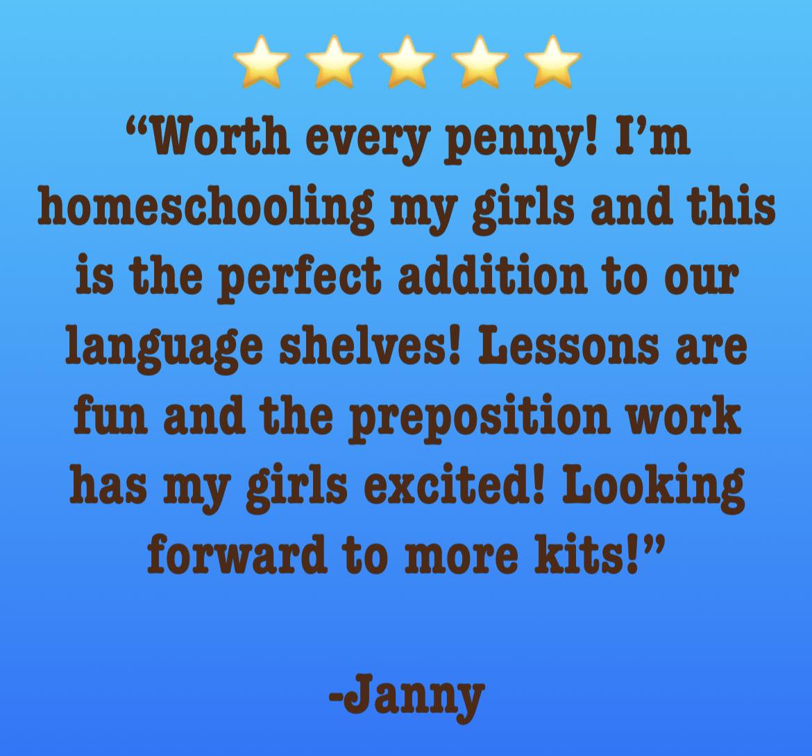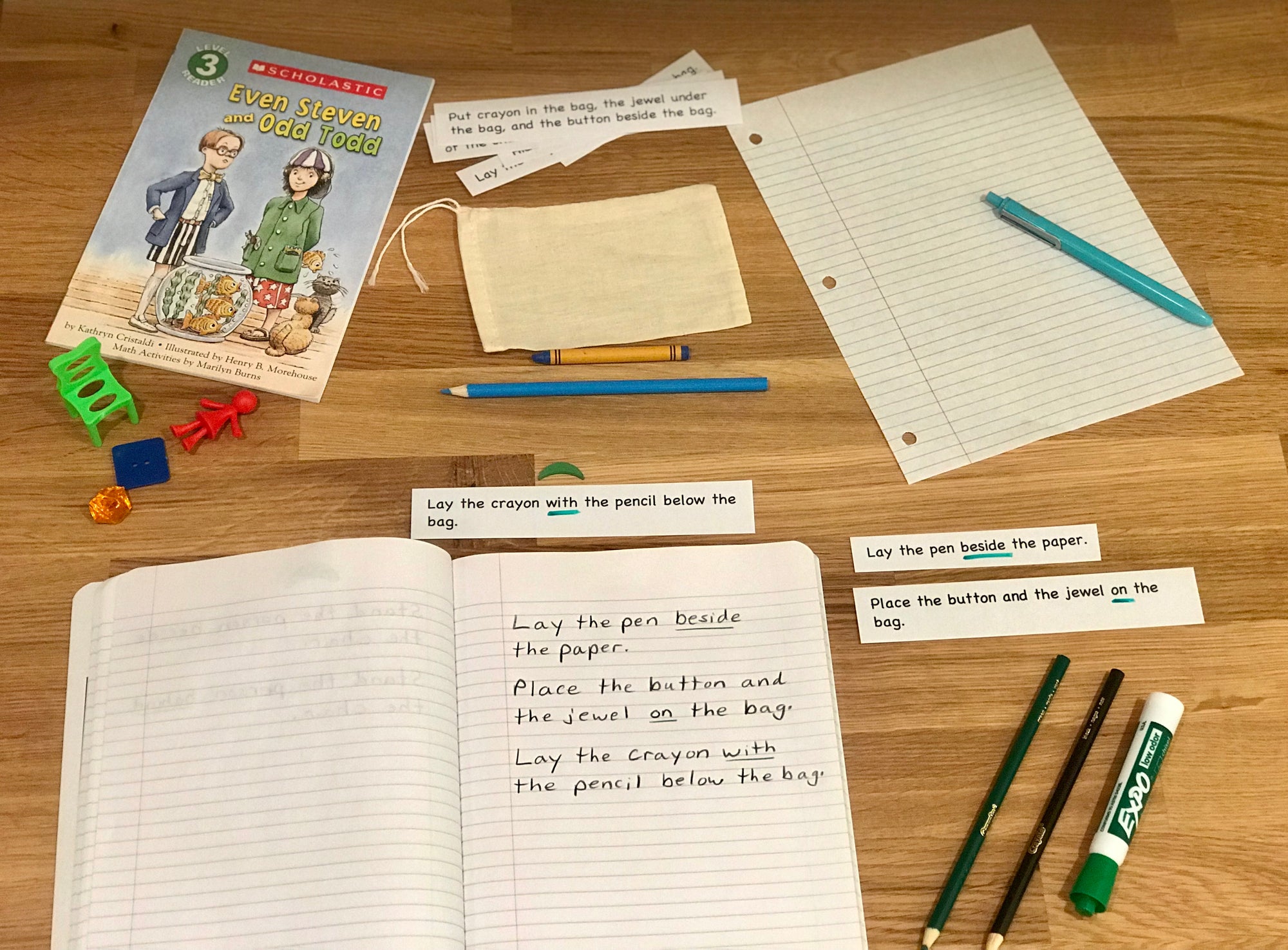 Materials included in lesson kit: Grammar symbols for verb (1 wooden and 1 paper), preposition (1 wooden and 1 paper), and adverb (1 wooden and 1 paper); a 10 page illustrated lesson plan in an organized folder; verb, preposition, and adverb definition cards; 3 verb activities; 3 preposition activities; 2 adverb activities; the following objects to use for various grammar activities: a small chair, a small person, a crayon, a button, and a jewel; a box of colored pencils, pencil sharpener, 3 dry erase markers (red, green, and orange); and a journal.