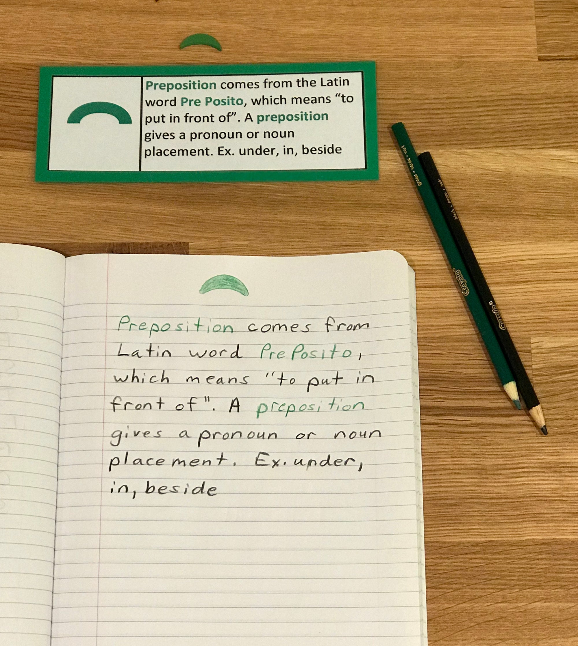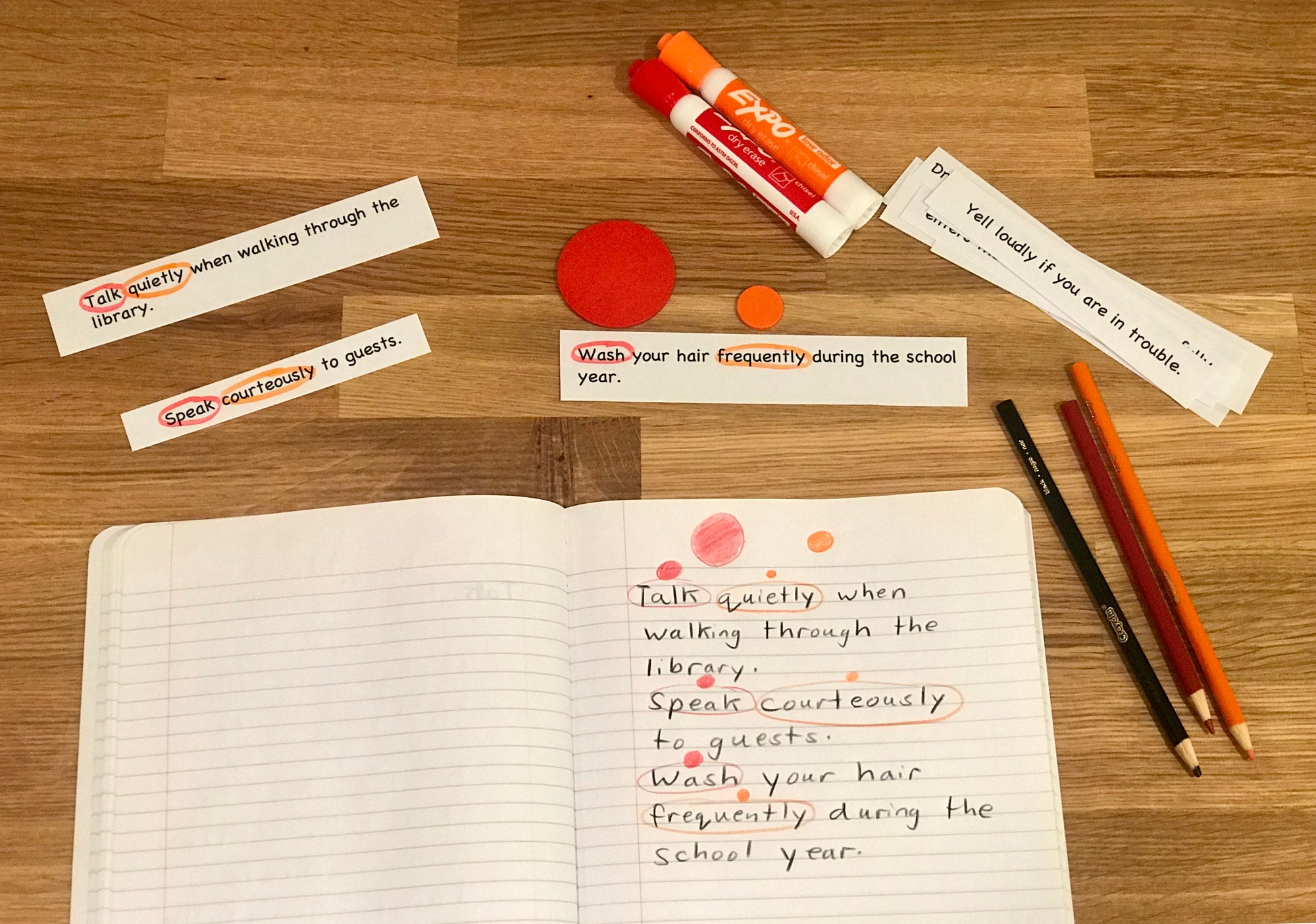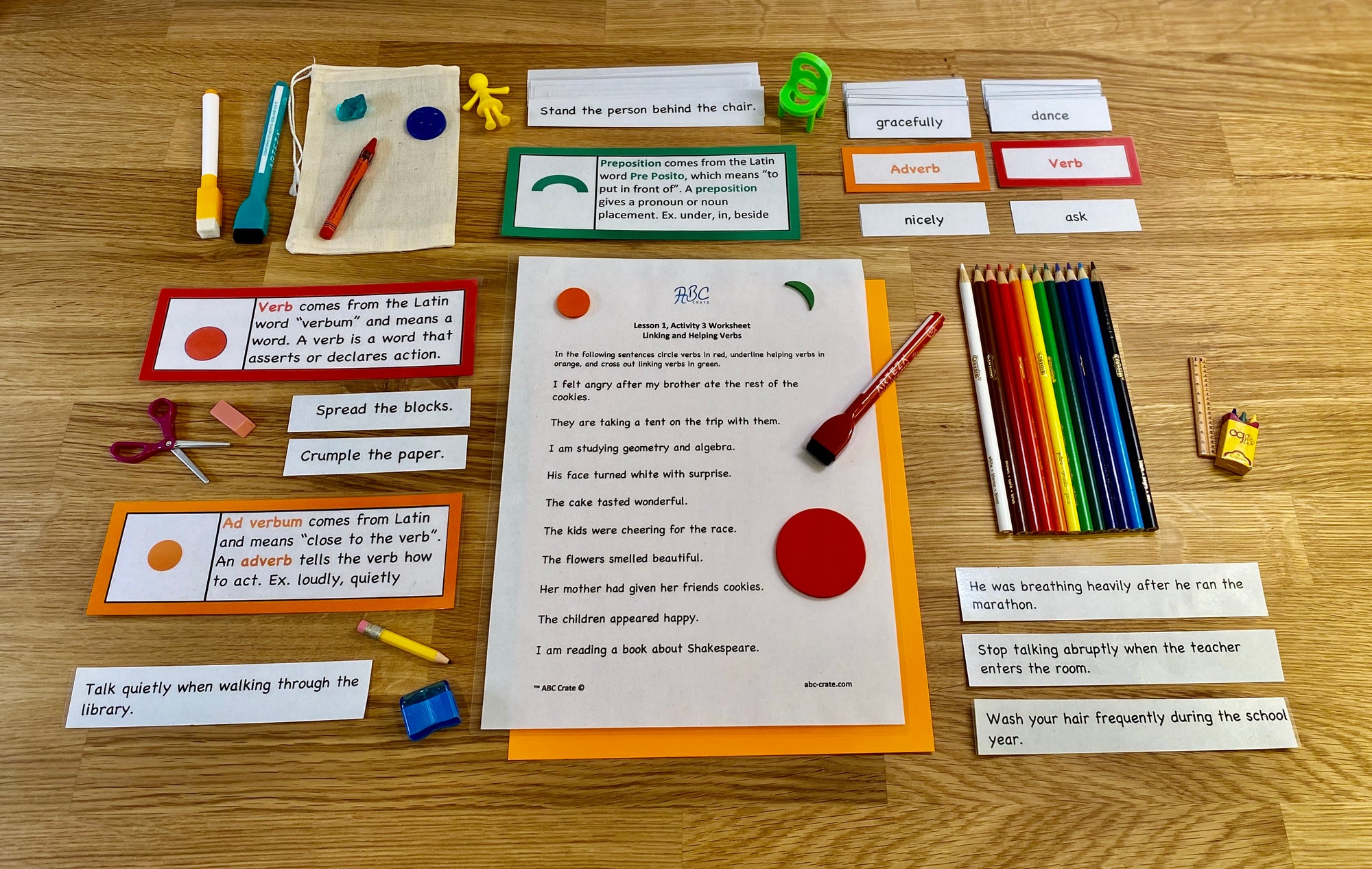 Lesson Intentions: Ability to identify different types of verbs, prepositions, and adverbs in everyday use; build grammatical awareness; differentiate linking and helping verbs; further develop visual acuity; development of reading and writing skills; language development; developing the ability to symbolize and record words; preparation for sentence analysis and sentence composition; and to experience grammar starting with concrete to abstract exercises.