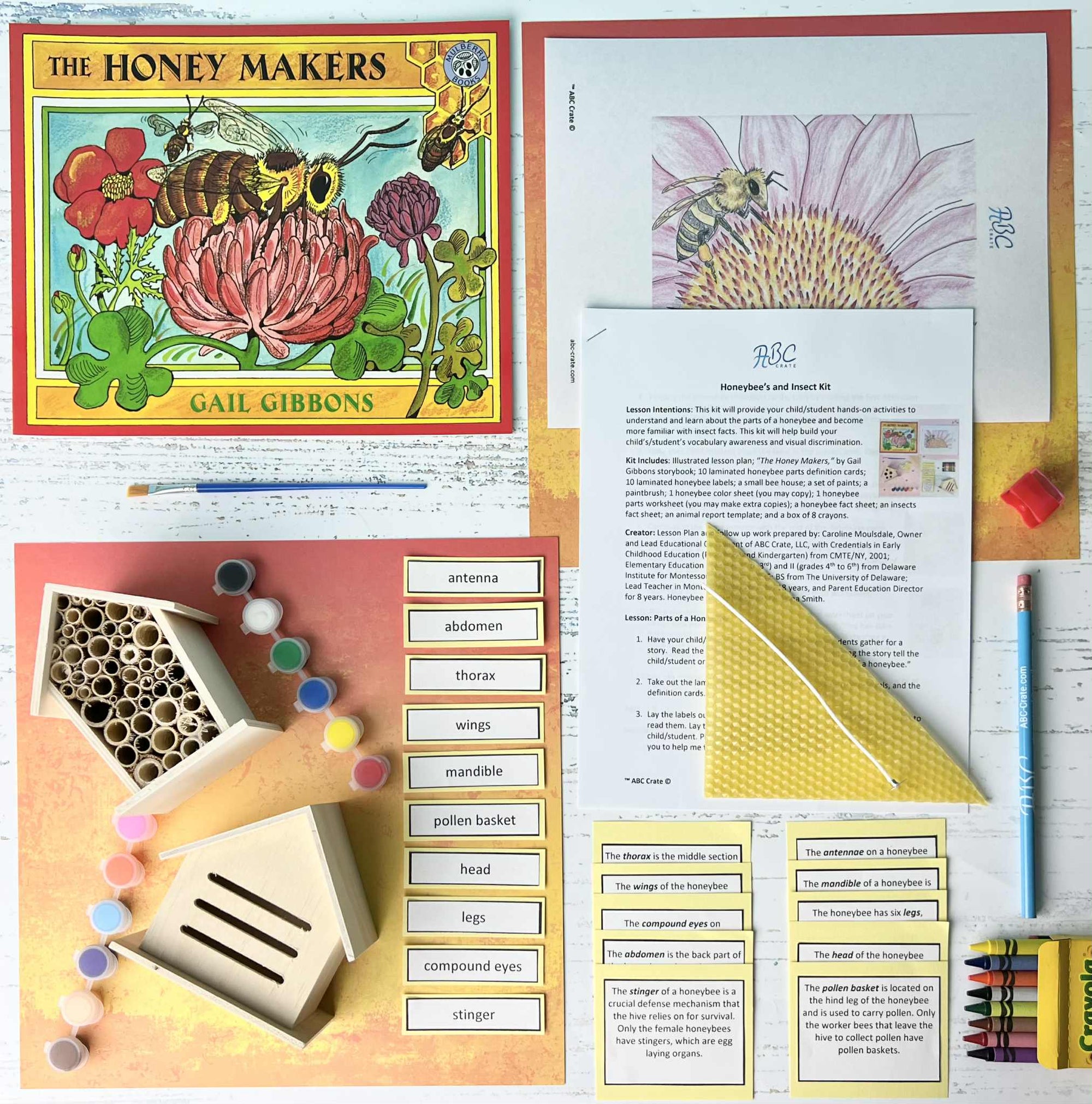 Lesson Intentions: This kit will provide your child/student hands-on activities to understand and learn about the parts of a honeybee and become more familiar with insect facts. This kit will help build your child’s/student’s vocabulary awareness and visual discrimination.