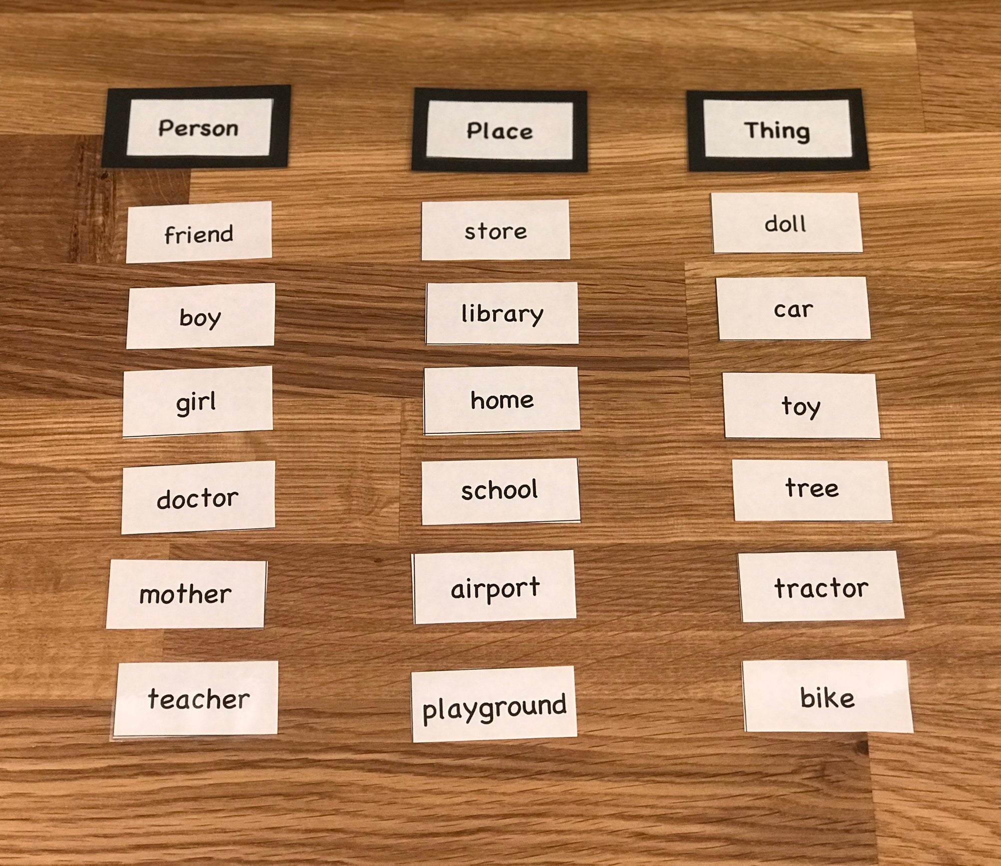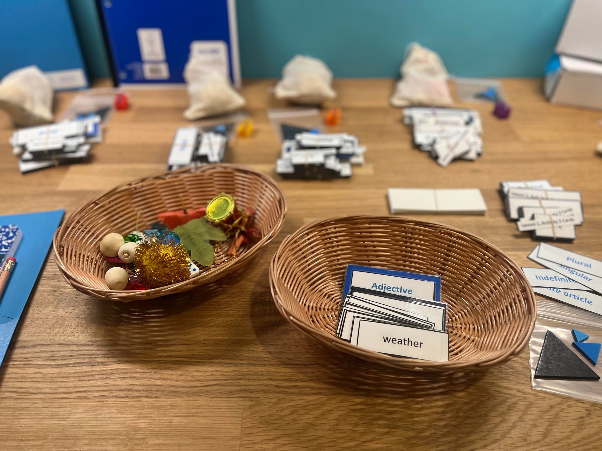 The Noun Family kit will explore grammar using ten different fun and hands-on activities. Your child/student will learn about the different types of nouns, adjectives, and articles including nouns classified as person, place, or thing; proper and common nouns; singular and plural nouns; masculine, feminine, and neutral nouns; descriptive adjectives; indefinite and definite articles; and singular and plural articles. The kit includes the following materials: an illustrated lesson plan in an organized folder; wooden grammar symbols for noun, adjective, and article; noun, adjective, and article definition cards; 6 noun activity card sets; 1 adjective card set; 20 objects to use for various grammar activities; blank labels to get you started; and a journal.