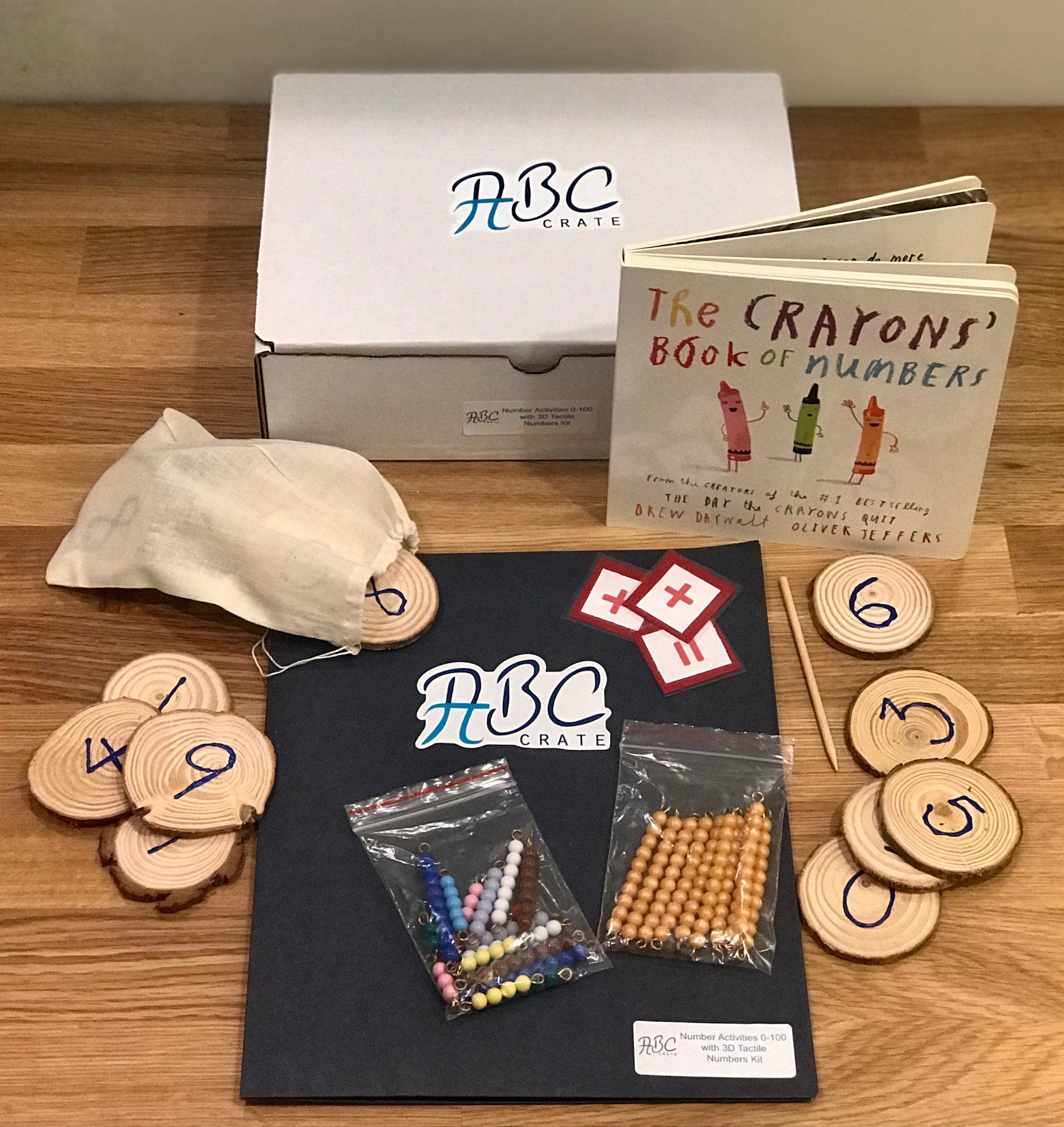 Materials included in the 0-100 multicolor numbers lesson kit: “The Crayons’ Book of Numbers”; 2 sets of short bead bars (numbers 1-9); 10 ten bars; 2 sets of 3D tactile numbers from 0-9; 2 addition signs; 1 equals sign; a counter; a dry erase marker, an illustrated lesson plan (12 pages); and 19 follow up worksheets (one is laminated for tracing activity).
