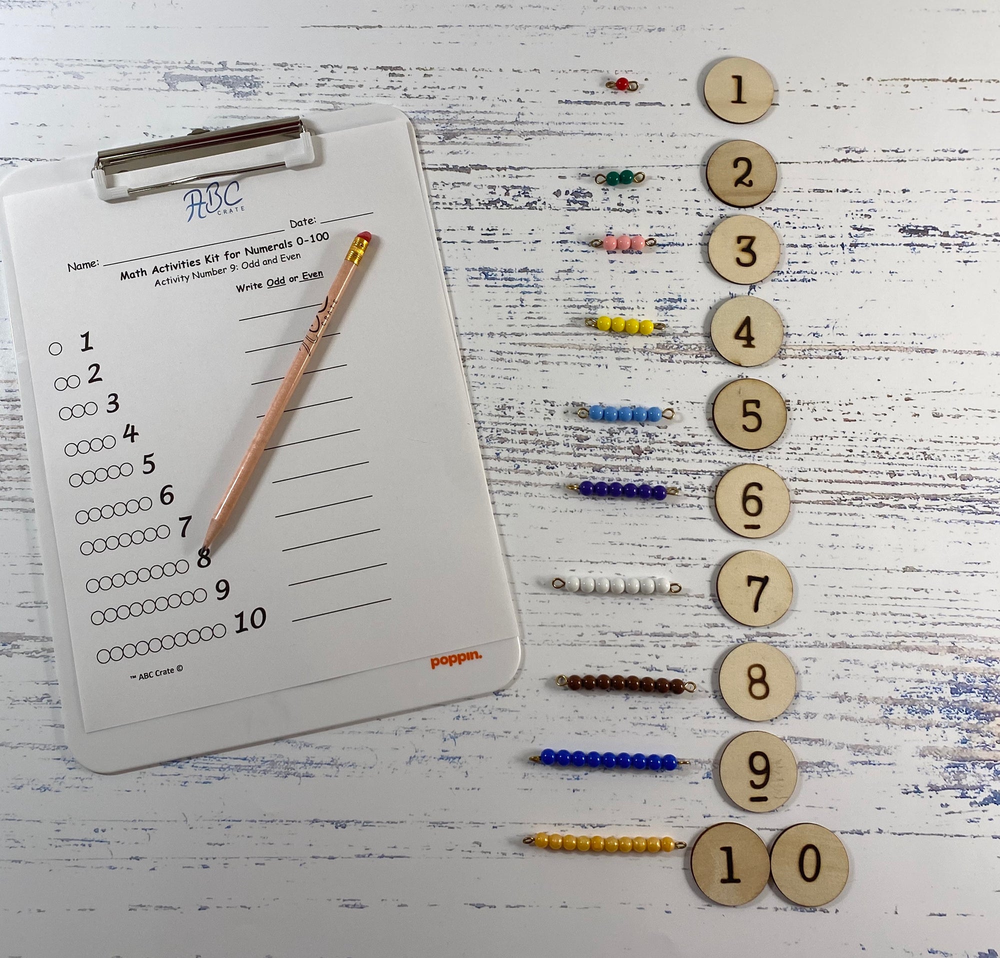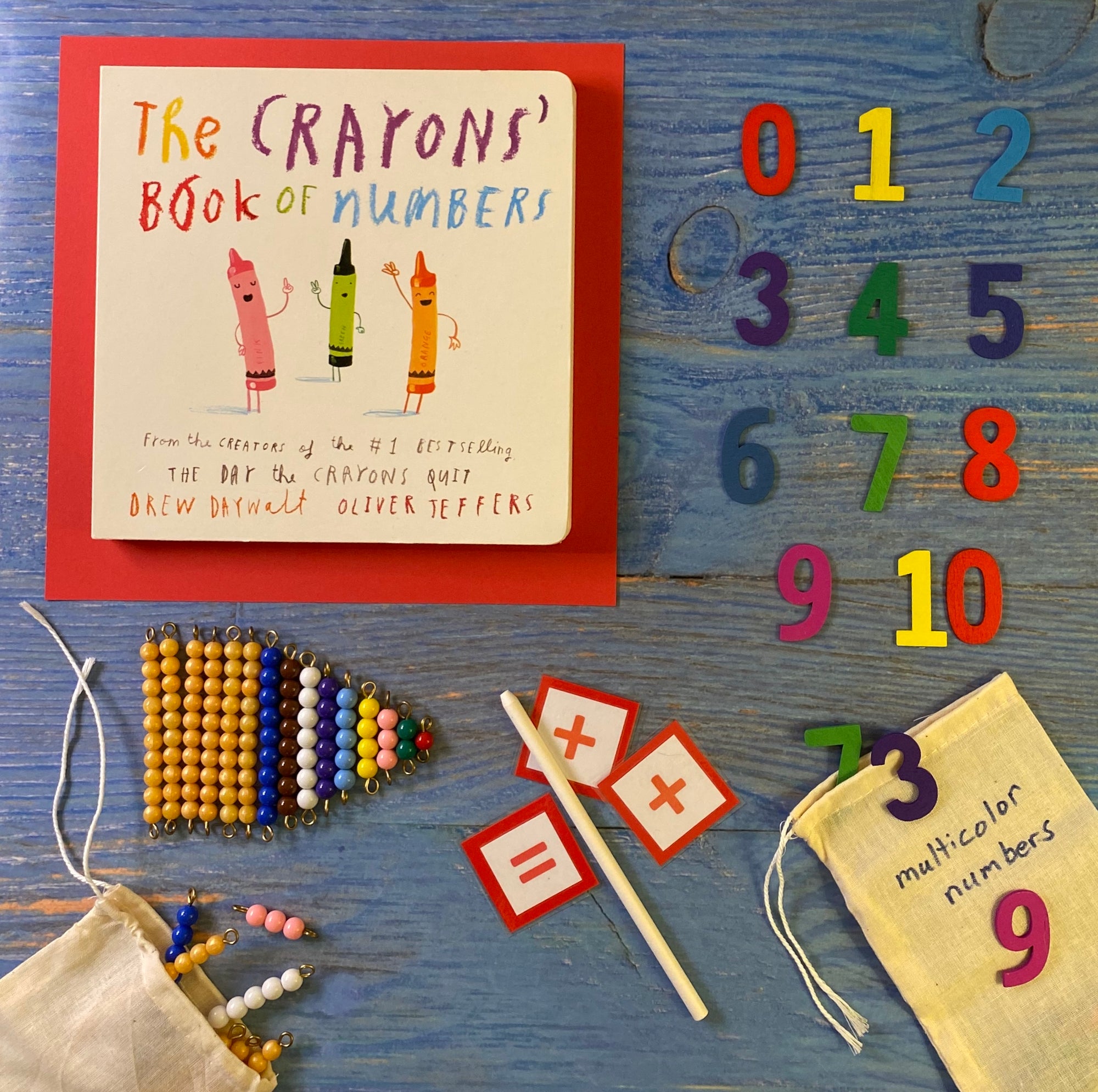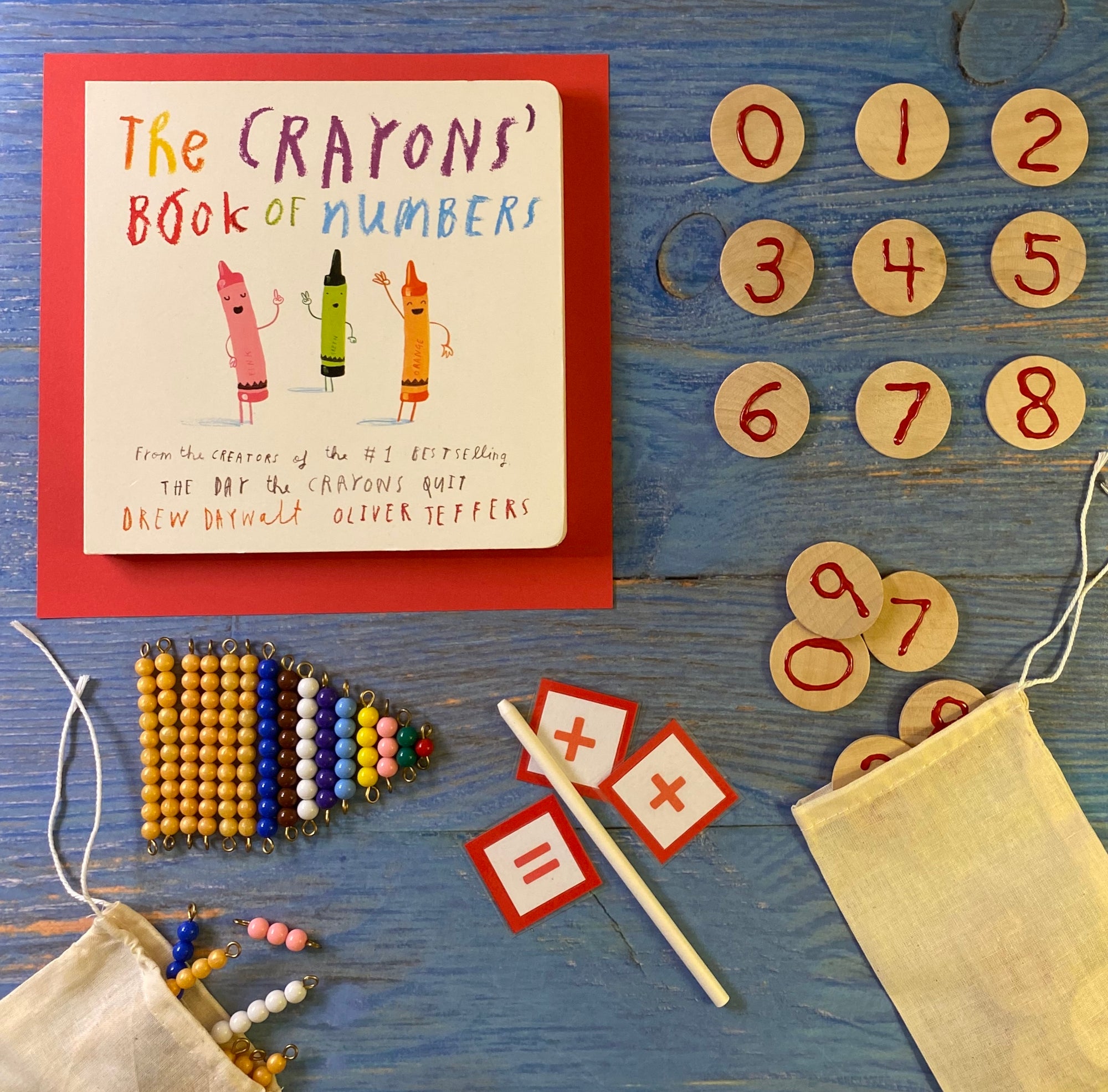 Materials included in the 0-100 wood burned lesson kit: “The Crayons’ Book of Numbers,” 2 sets of short bead bars (numbers 1-9), 10 ten bars, 2 sets of wood burned numerals from 0-9, 2 addition signs, 1 equals sign, a counter, dry erase marker, an illustrated lesson plan (12 pages), 19 pages (one is laminated for tracing activity) of follow up worksheets to go with activities.
