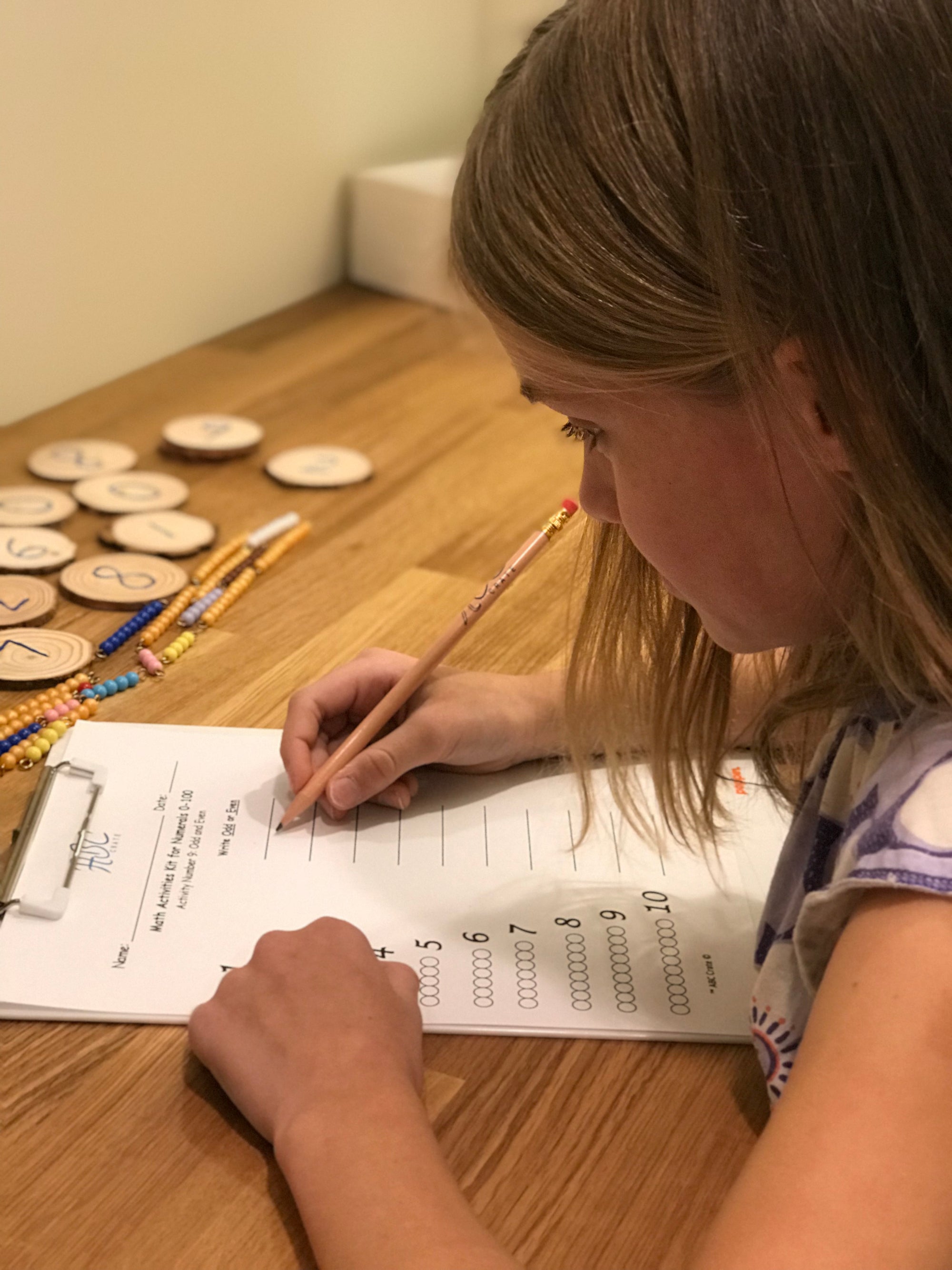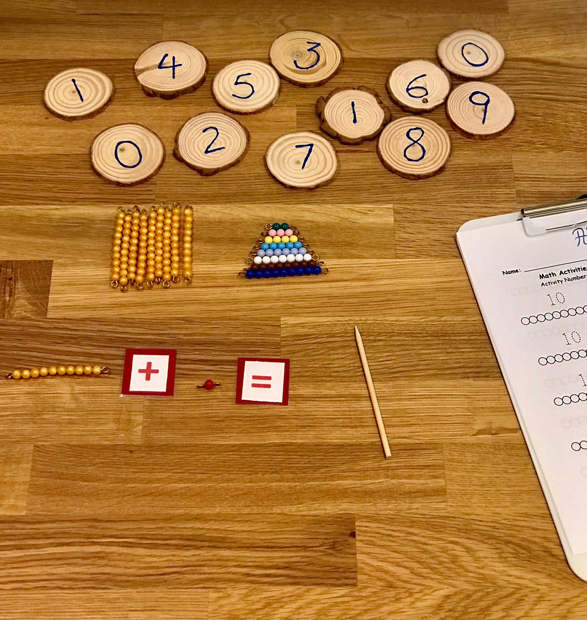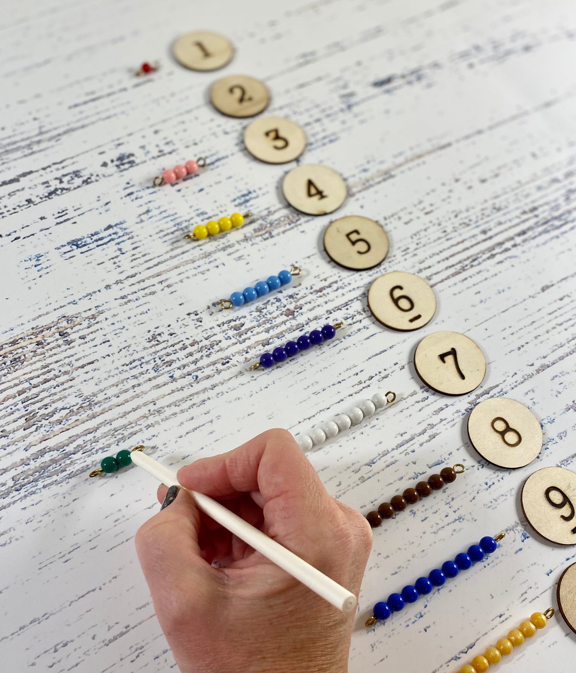 Materials included in the 0-100 wood burned lesson kit: “The Crayons’ Book of Numbers,” 2 sets of short bead bars (numbers 1-9), 10 ten bars, 2 sets of wood burned numerals from 0-9, 2 addition signs, 1 equals sign, a counter, dry erase marker, an illustrated lesson plan (12 pages), 19 pages (one is laminated for tracing activity) of follow up worksheets to go with activities.