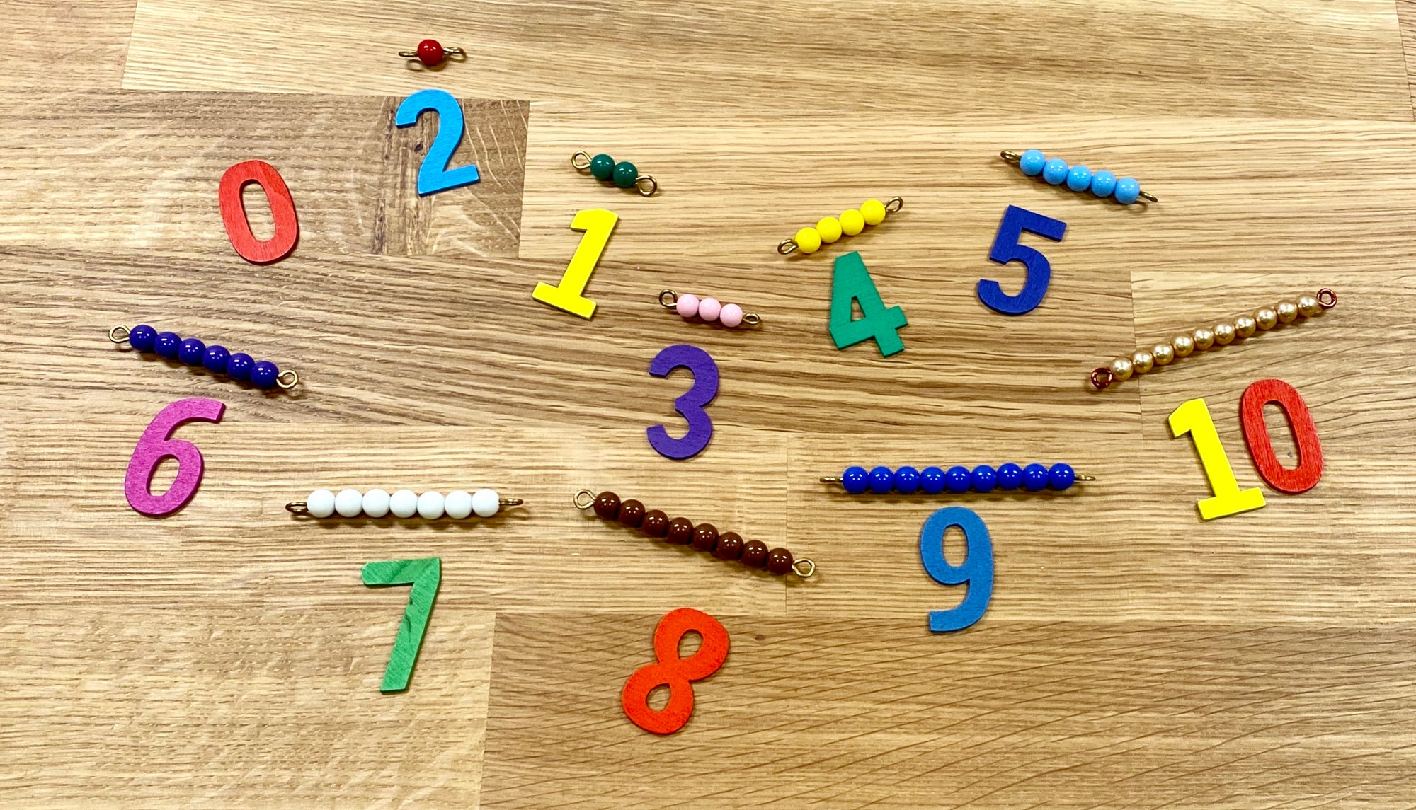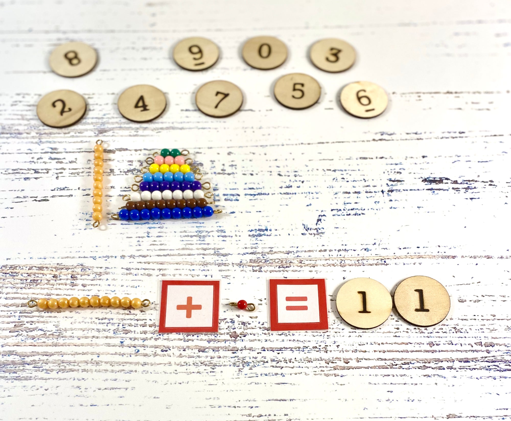The Number Activities 0-100 includes lessons and activities including: The sensorial presentation and gradation of short bead bars 1-10, linear counting from 1-10, matching numerals and quantities, and introducing concept of “zero”; linear counting and adding numbers 0-10 to make 11-20, and matching numerals and quantities11-20; higher numbers through 100; learning linear counting and adding random numbers combinations to practice adding higher quantities through 100; and learning the concept of odd and even using pairing techniques.