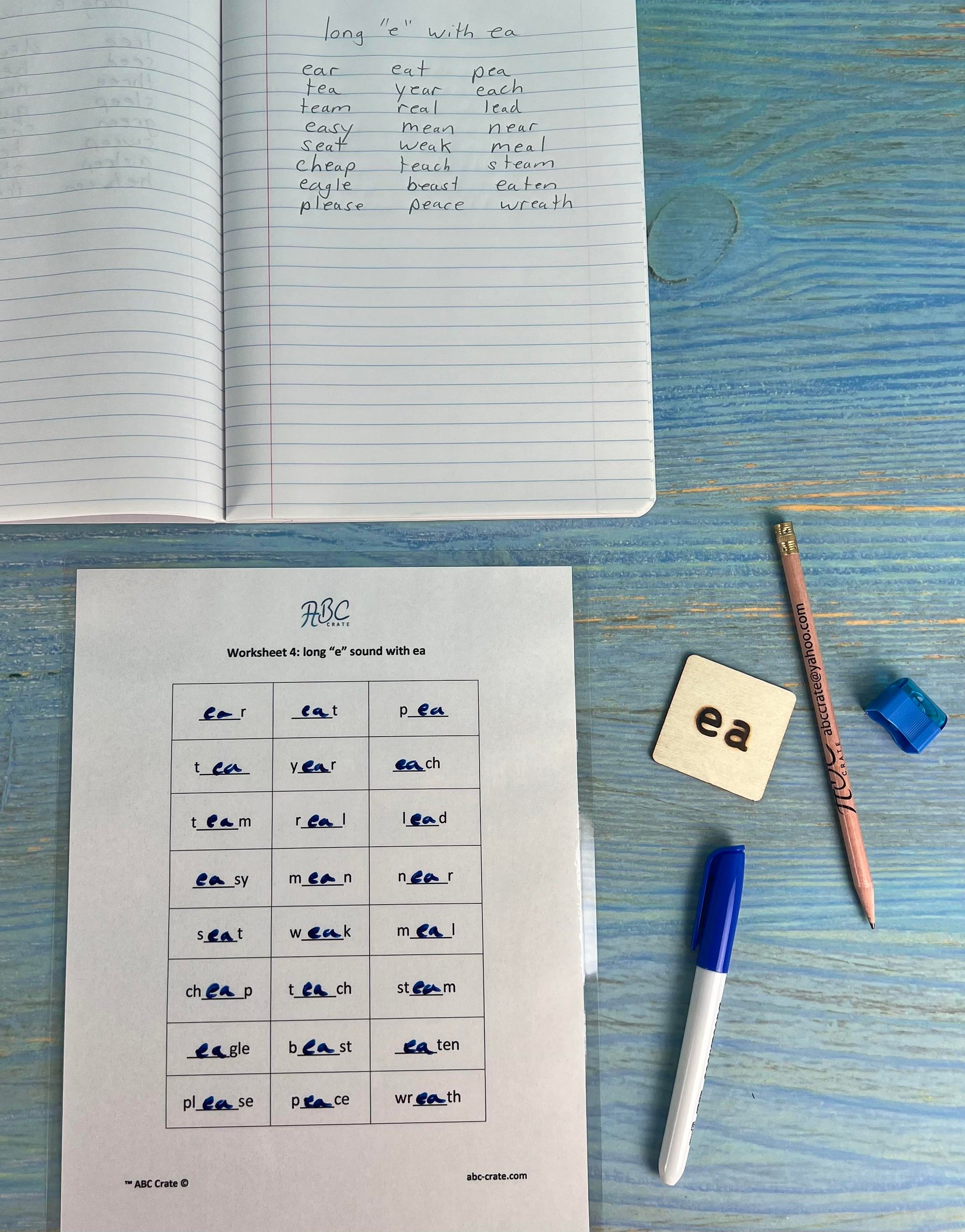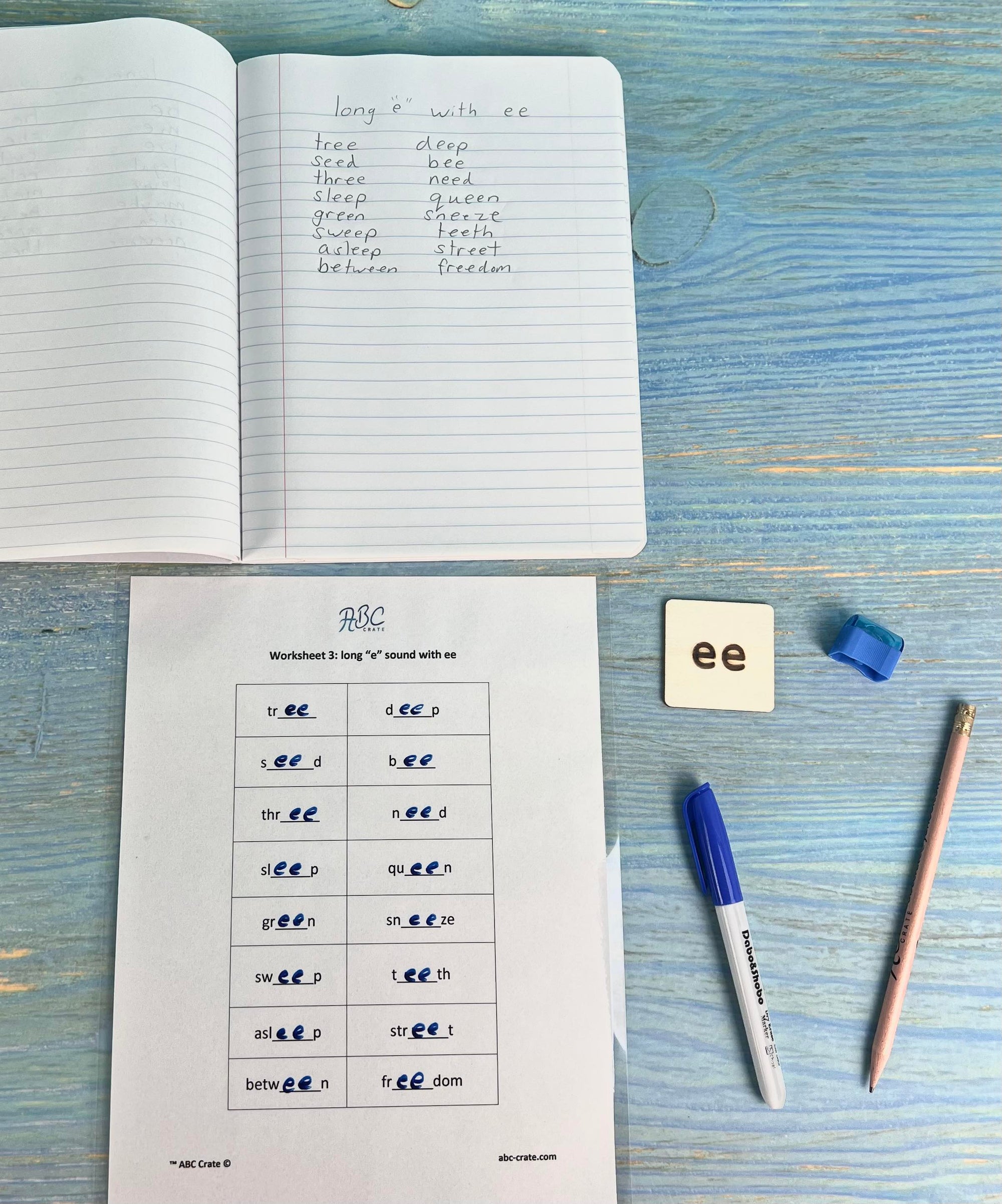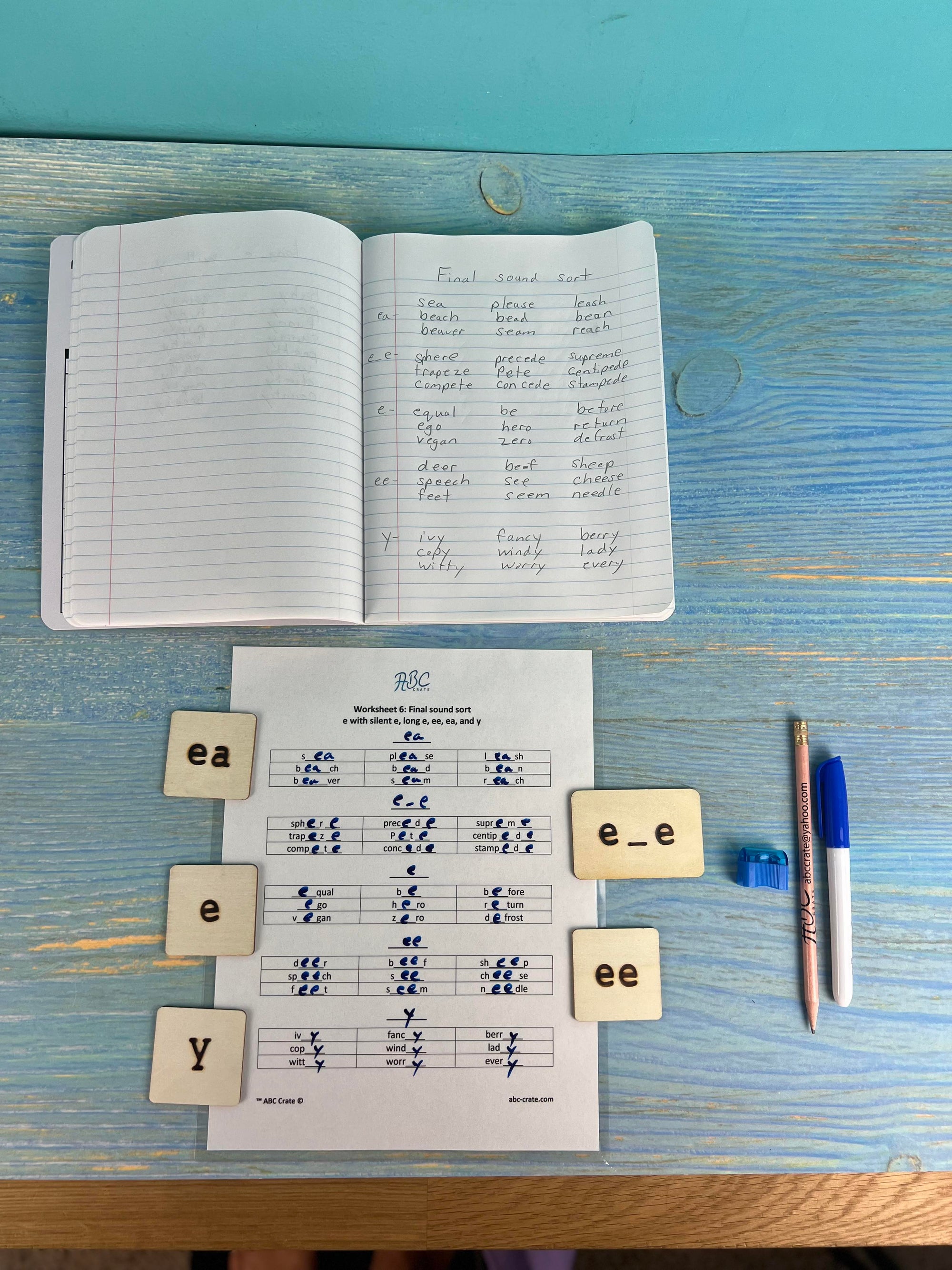 Kit Includes: Illustrated lesson plan with 6 different activities (14 pages including worksheets); hand burned wooden phonograms: “ee, ea, y, e, and e_e; a dry erase pen; a pencil sharpener, and a journal.