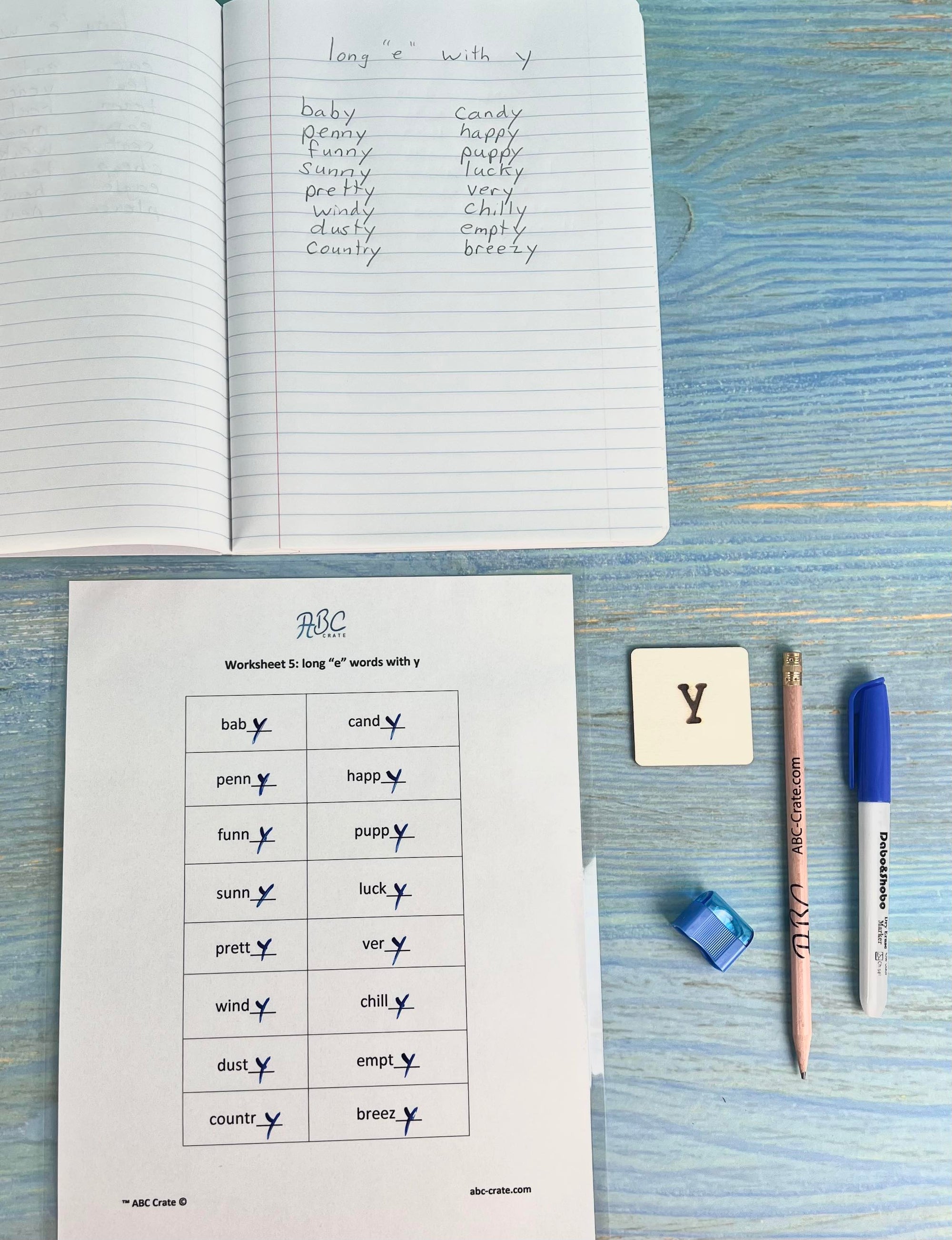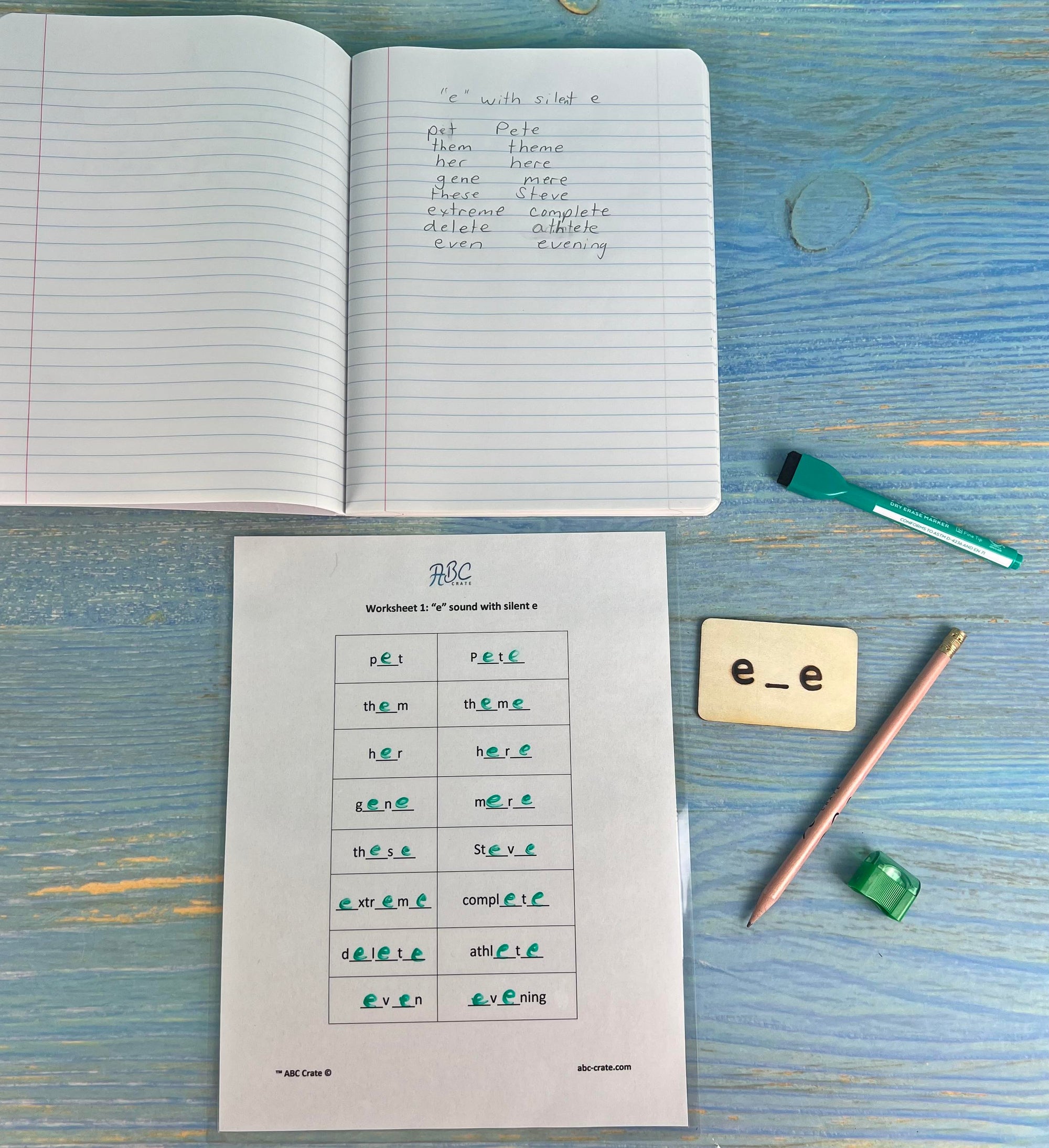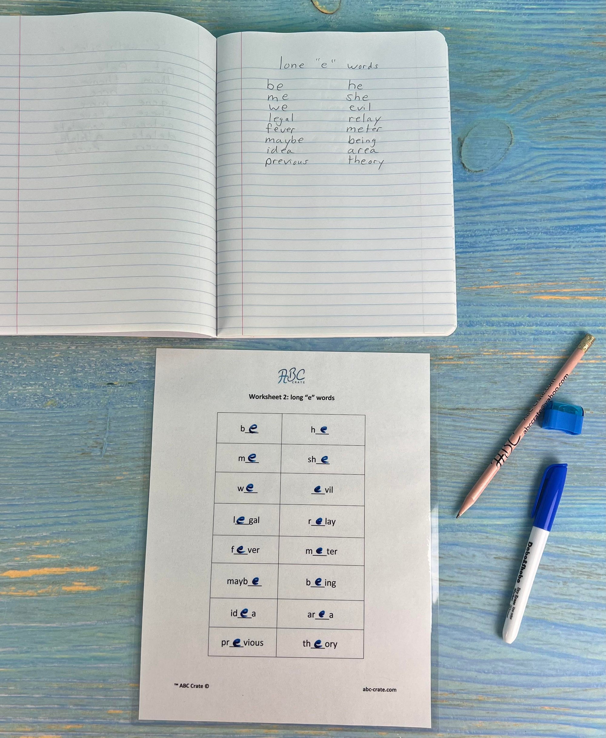 Kit Includes: Illustrated lesson plan with 6 different activities (14 pages including worksheets); hand burned wooden phonograms: “ee, ea, y, e, and e_e; a dry erase pen; a pencil sharpener, and a journal.