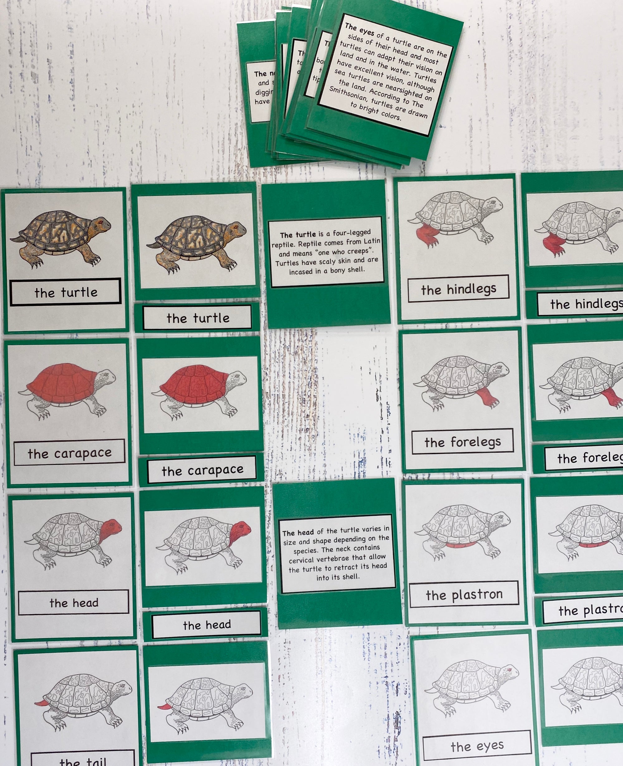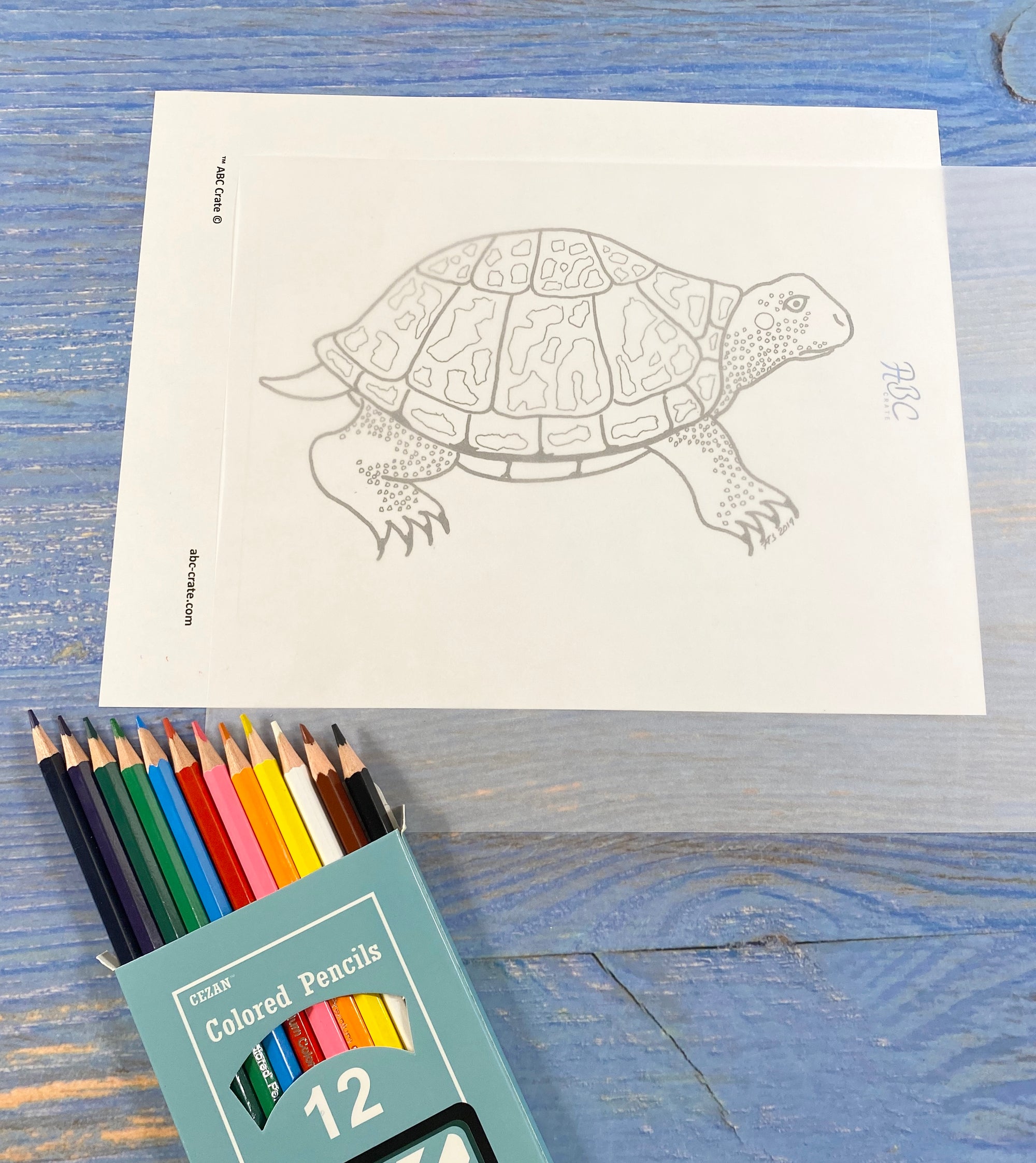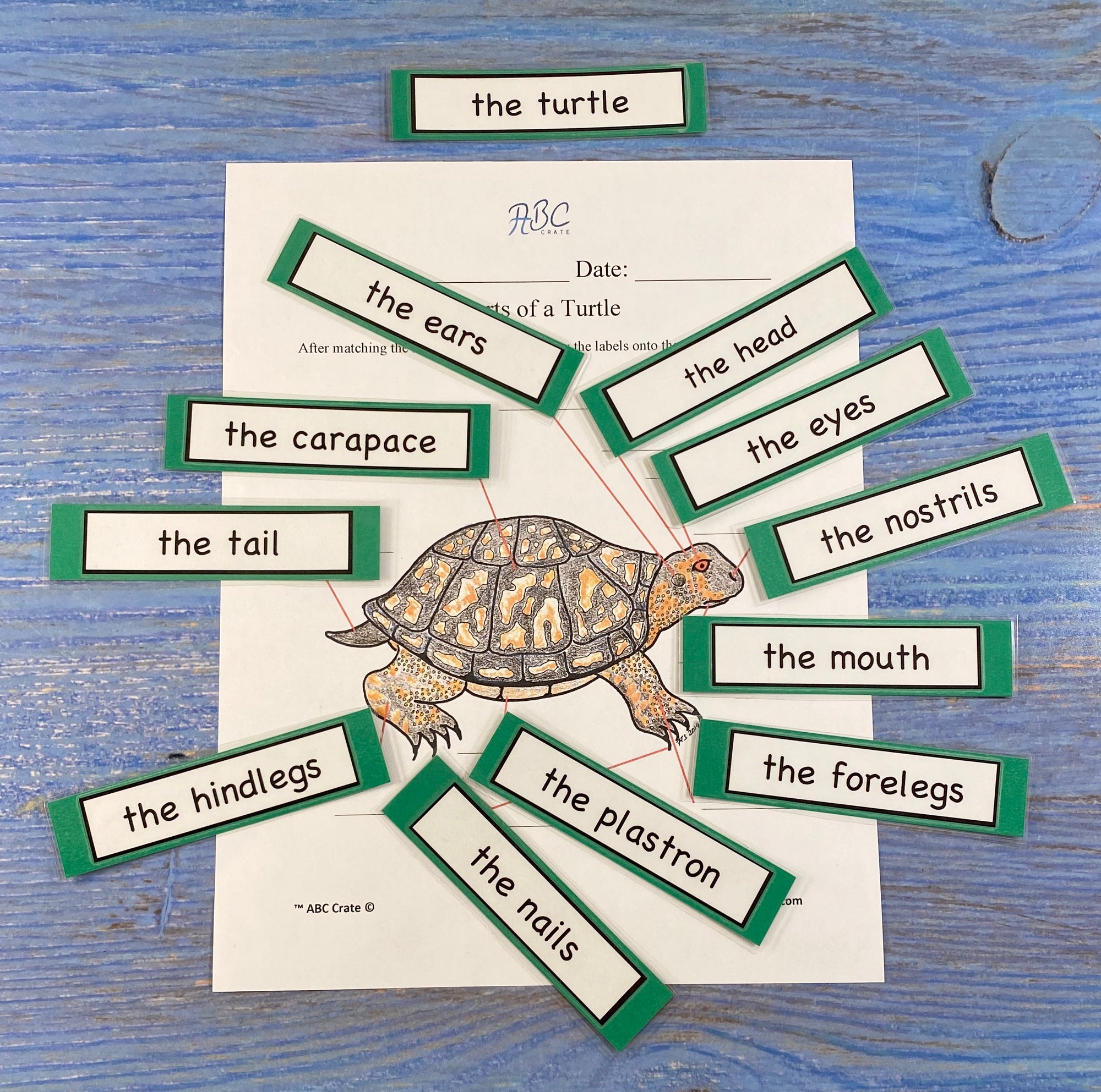 Kit Includes: Illustrated lesson plan; “Turtles” (a National Geographic kids favorite) storybook; laminated four-part turtle matching cards; full-size laminated turtle picture; 2 copies of “parts of a turtle” worksheets (1 color and 1 black and white to color); 4 “parts of a turtle” mini color sheet pages (for your child/student to make their own “parts of” booklets); turtle color page; a three-page animal report template; a miniature turtle figurine, tracing paper (2 sheets), a pencil sharpener; and color pencils. You are allowed to make copies of worksheets with the purchase of this kit for your use. * At different times of the year, when our ABC turtles shed, crates may include a piece of their scute. They will come in a plastic bag for your child/student to explore. If you let your child/student handle them, they should wash their hands right after.