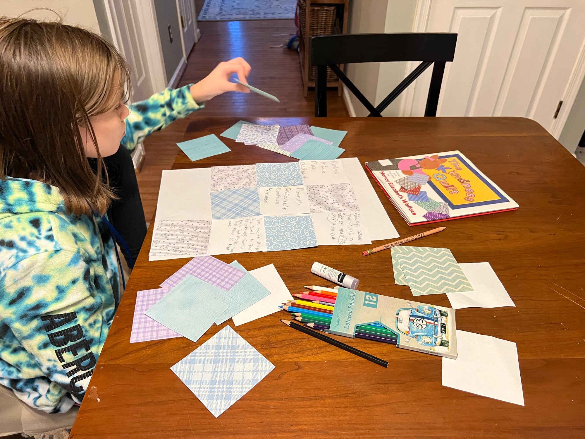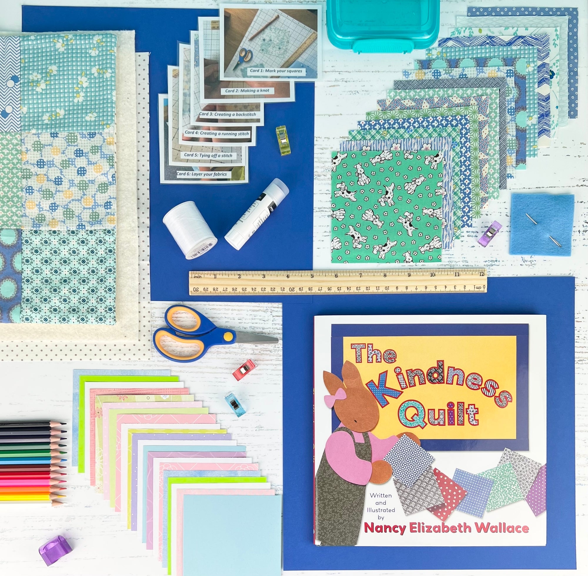 Kit Includes: "The Kindness Quilt,” hardback story book by Nancy Elizabeth Wallace; illustrated directions; 7 laminated instruction cards for some more difficult steps; fifteen 4 ½ by 4 ½ fabric squares (they will choose twelve to use); 12 ½ by 16 ½ inch fabric backing; 12 ½ by 16 ½ batting; 1 needle in a container; 1 spool of thread; 4 quilting clips; a pair of scissors; twenty 4 by 4 sheets of paper (15 mixed pattern and solid colors, 5 white); 1 glue stick; colored pencils; a ruler; a pencil sharpener; and two 12 by 18 pieces of paper (will come rolled, lay out and put books on for a day or two to smooth out). (Optional-there are sections where you will need an iron. Should you not have one available, we will give you an alternate method to smooth out sections). This activity helps build the following skills: concentration, coordination, small muscle development, eye-hand coordination, fine motor control, development of three finger grasp, care of self, and left to right progression for reading and writing development. Your child/student will learn the following stitches: backstitch, running stitch, and blind stitch.