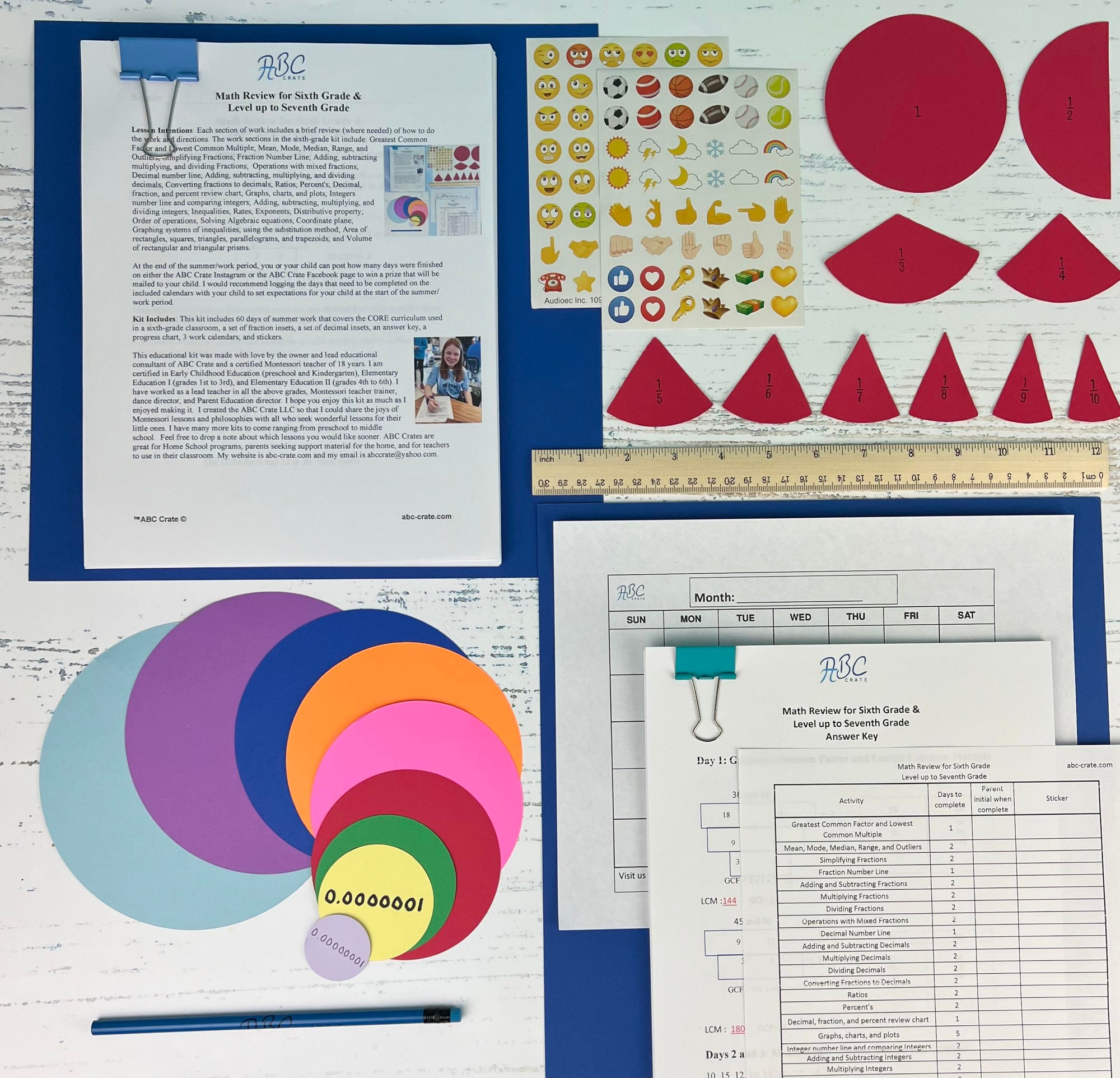 Each section of work includes a brief review (where needed) of how to do the work and directions. The work sections in the sixth-grade kit include: Greatest Common Factor and Lowest Common Multiple; Mean, Mode, Median, Range, and Outliers; Simplifying Fractions; Fraction Number Line; Adding, subtracting multiplying, and dividing Fractions; Operations with mixed fractions; Decimal number line; Adding, subtracting, multiplying, and dividing decimals; Converting fractions to decimals; Ratios; Percent's; Decimal, fraction, and percent review chart; Graphs, charts, and plots; Integers number line and comparing integers; Adding, subtracting, multiplying, and dividing integers; Inequalities; Rates; Exponents; Distributive property; Order of operations; Solving Algebraic equations; Coordinate plane; Graphing systems of inequalities; using the substitution method; Area of rectangles, squares, triangles, parallelograms, and trapezoids; and Volume of rectangular and triangular prisms.
