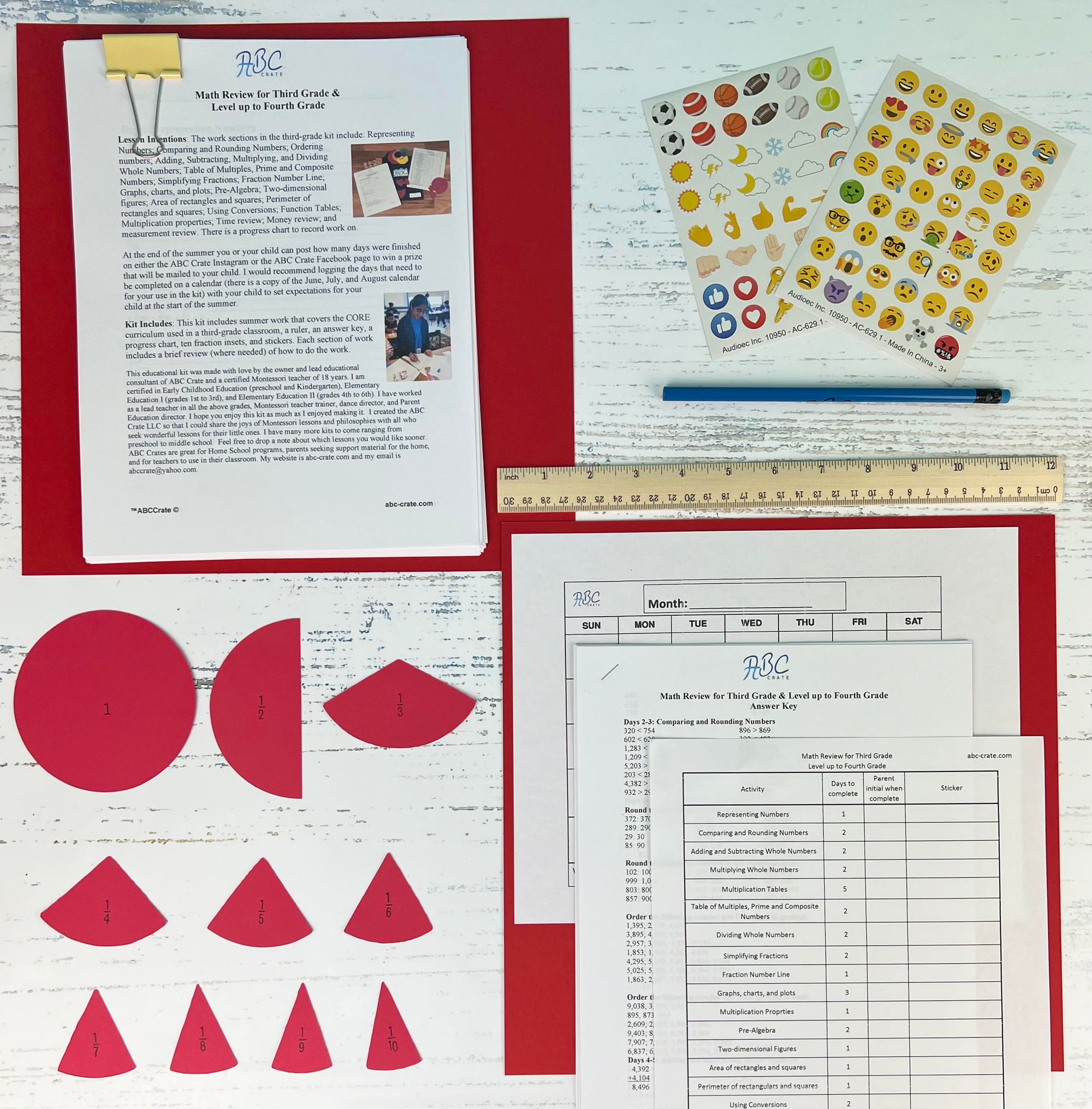 This kit includes summer work that covers the CORE curriculum used in a third-grade classroom, a ruler, an answer key, a progress chart, ten fraction insets, 3 calendars, and stickers. Each section of work includes a brief review (where needed) of how to do the work.