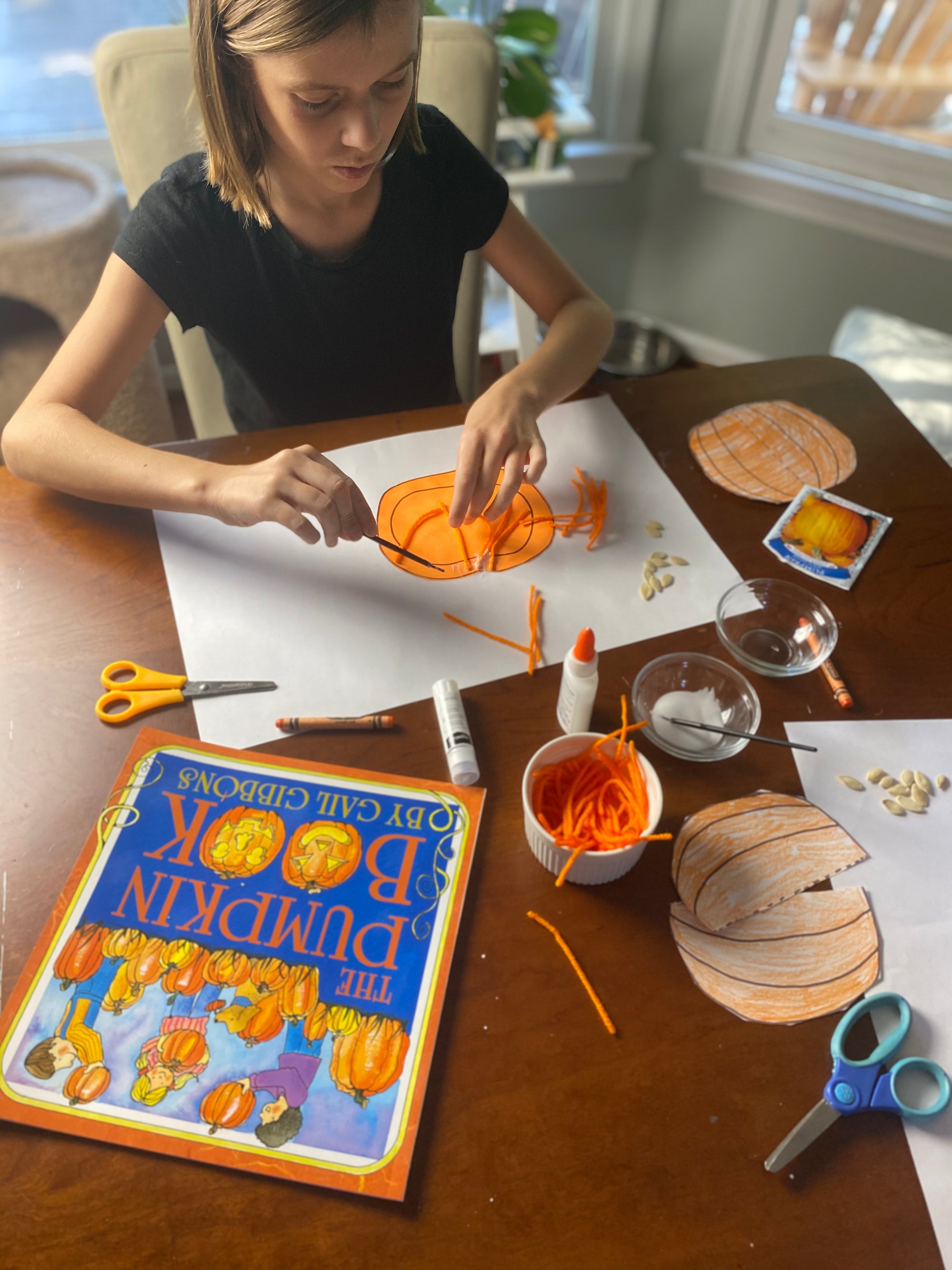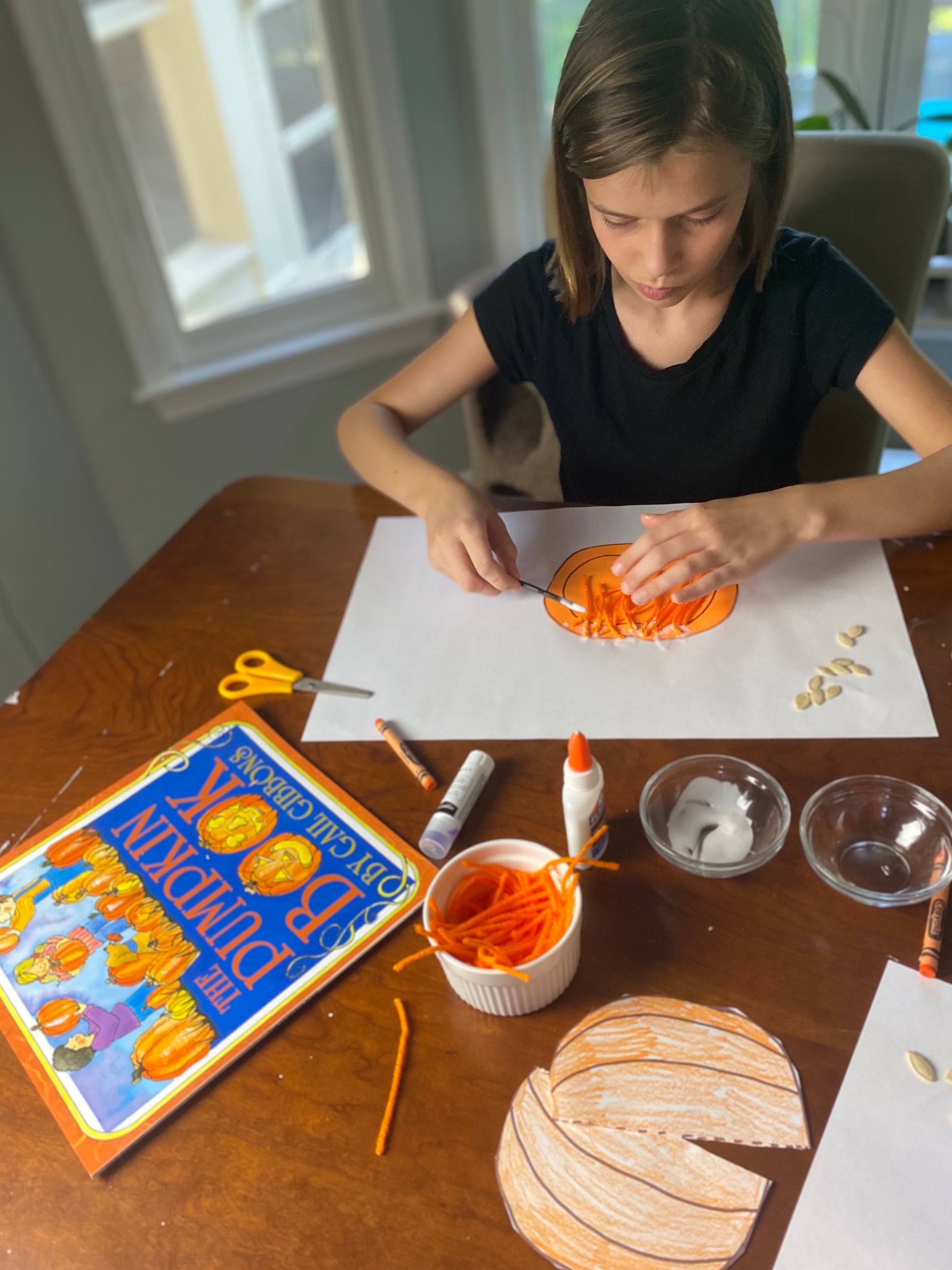 Kit Includes: "The Pumpkin Book,” by Gail Gibbons; illustrated directions in a folder; 2 sheets of 9 x 12 paper; a packet of pumpkin seeds; 1 glue stick; a box of 8 crayons; a 1.25 oz. bottle of wet glue; orange yarn pieces for pumpkin pulp; scissors; a glue brush; pumpkin templates to cut out; labels to cut out; a paper stem; a paper leaf; a green pipe cleaner, a beige pipe cleaner; and a 1 oz. paper ramekin to use for glue. For ages pre-school and up.