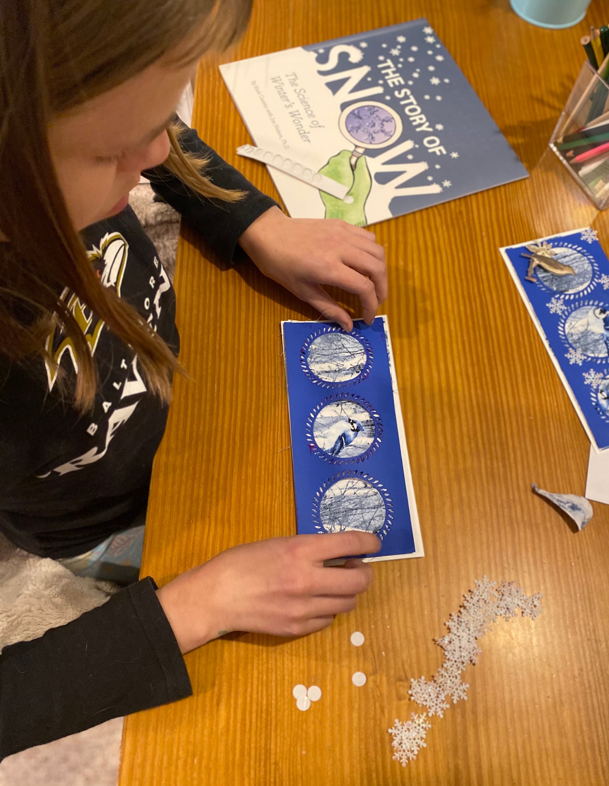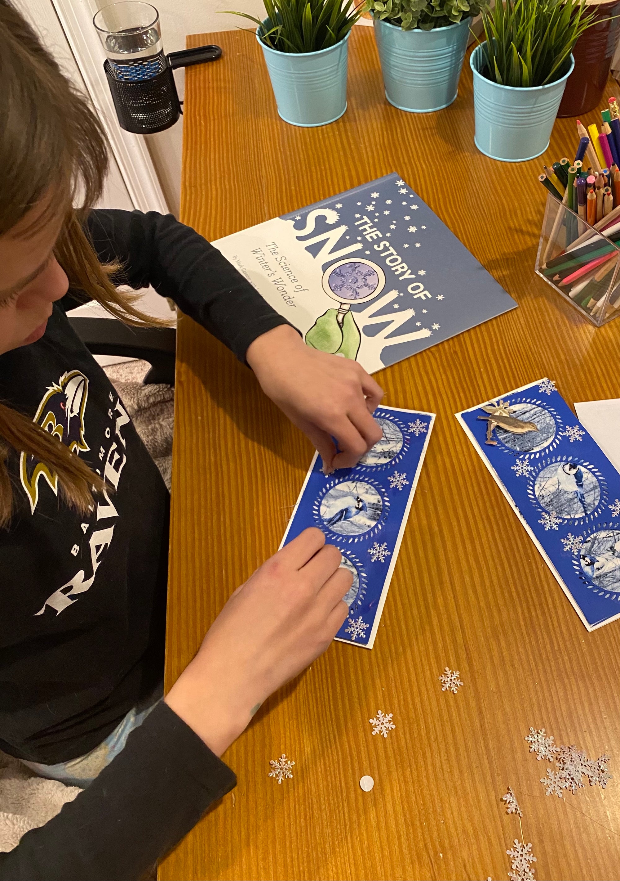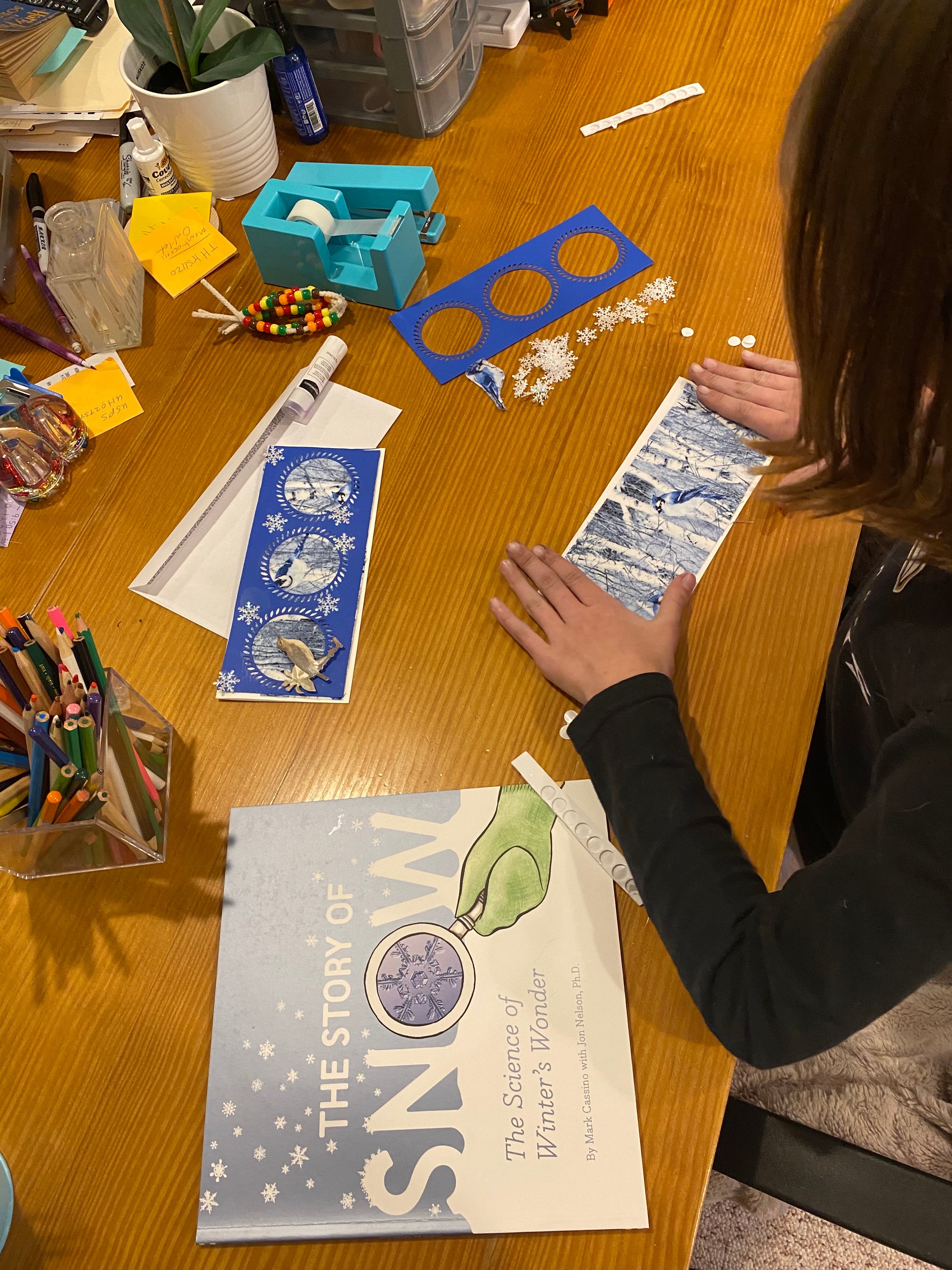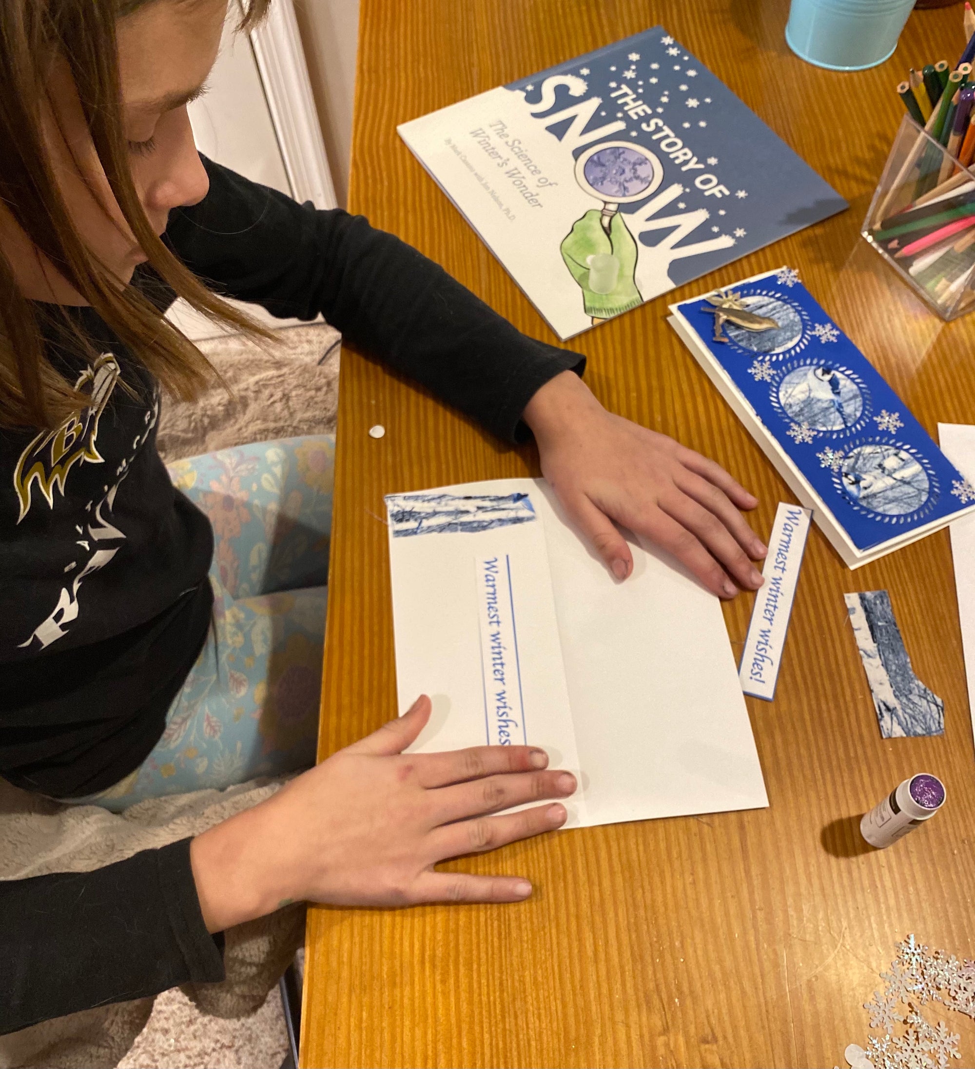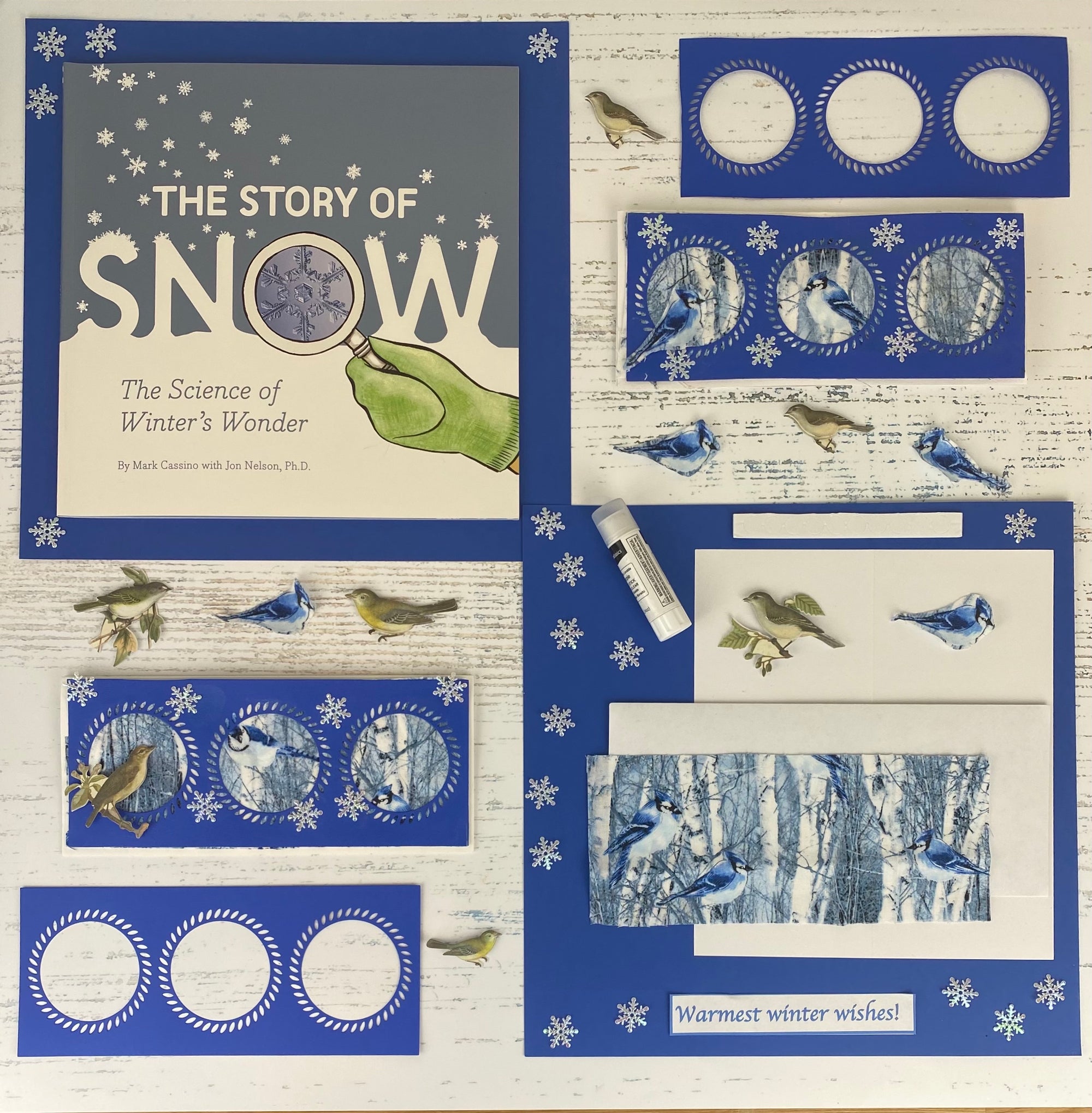 Kit Includes: “The Story of Snow, The Science of Winter’s Wonder” storybook by Mark Cassino with Jon Nelson, Ph.D.; illustrated directions in a folder; two 9 x 3 ¾ folding white notecards; two 9 ½ x 4 envelopes; 2 blue card templates with 3 circular openings, 2 pieces of winter bird fabric; 2 bird cut out’s; a strip of 10 foam double-sided adhesives; a small bag of snowflakes for decorating; 2 “Warmest Winter Wishes” and 2 "thank you" labels; and 1 glue stick.