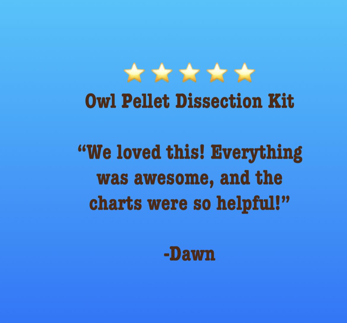 Owl Pellet Dissection Kit: Comes with "Owls" story book by National Geographic kids, directions, an owl pellet worksheet, 2 owl pellets, tongs, 2 sets of plastic disposable gloves, a stick to dissect the pellet, a dissection mat to sort bones, and a magnifying glass.