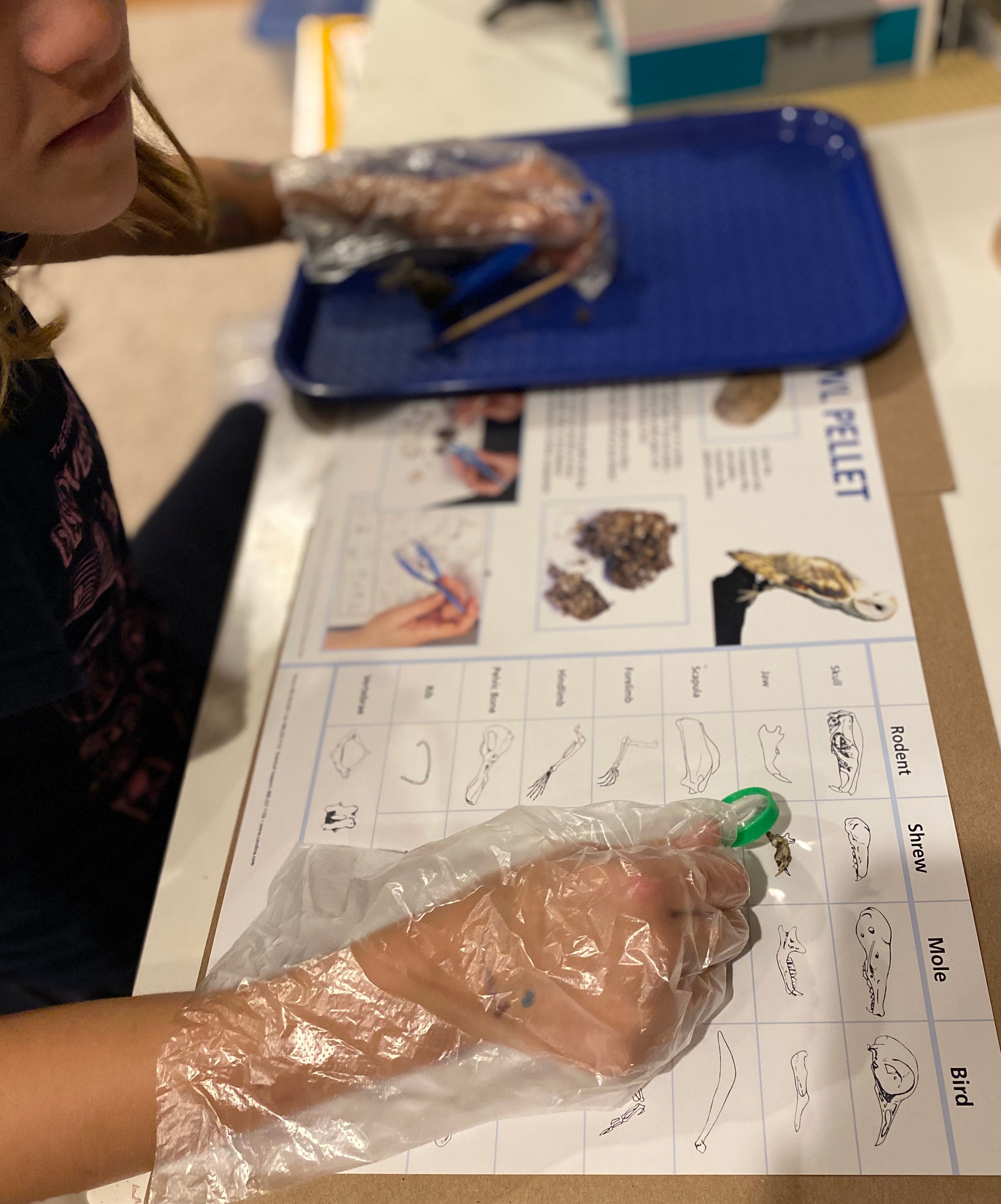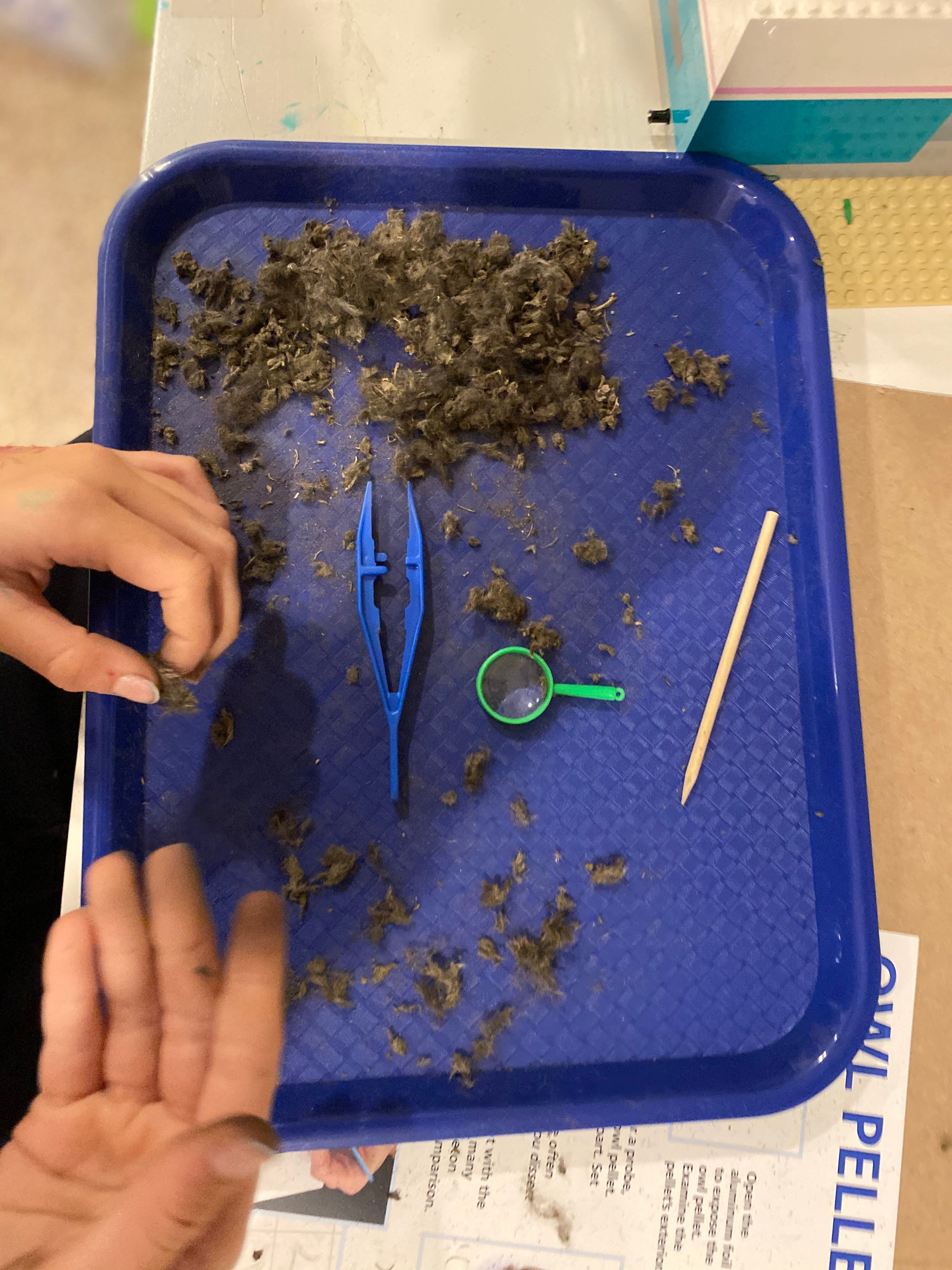 Owl pellets are tight pellets that the owl has regurgitated. They include the parts of animals that the owl is unable to digest including small bones, feathers, and fur. The owl pellets are sterilized so they can be touched, but we have included gloves in the kit. If your children choose to touch the materials in their exploration, they should wash their hands afterward.
